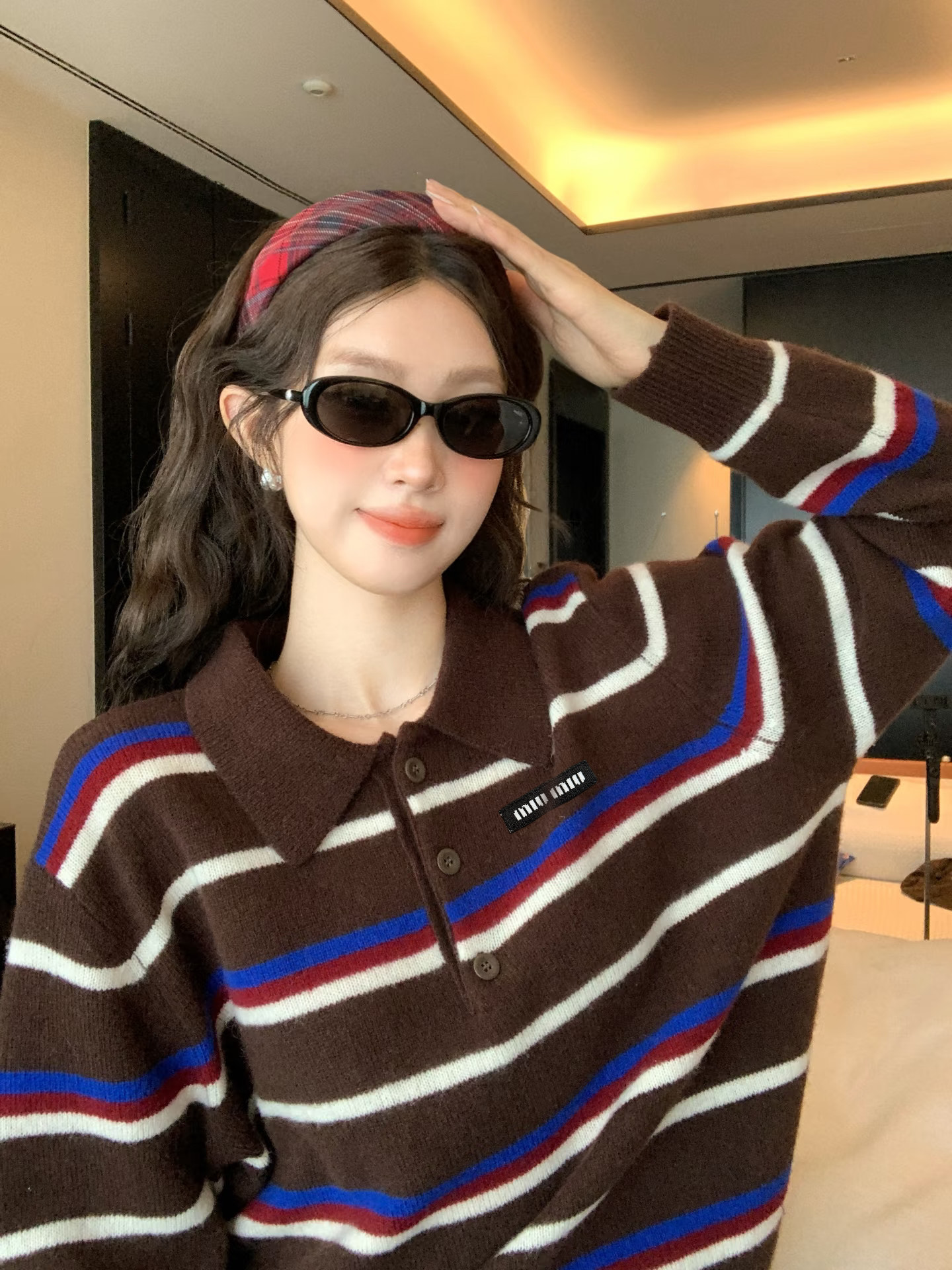 Miumiu缪缪家新款撞色条纹针织翻领polo长袖毛衣