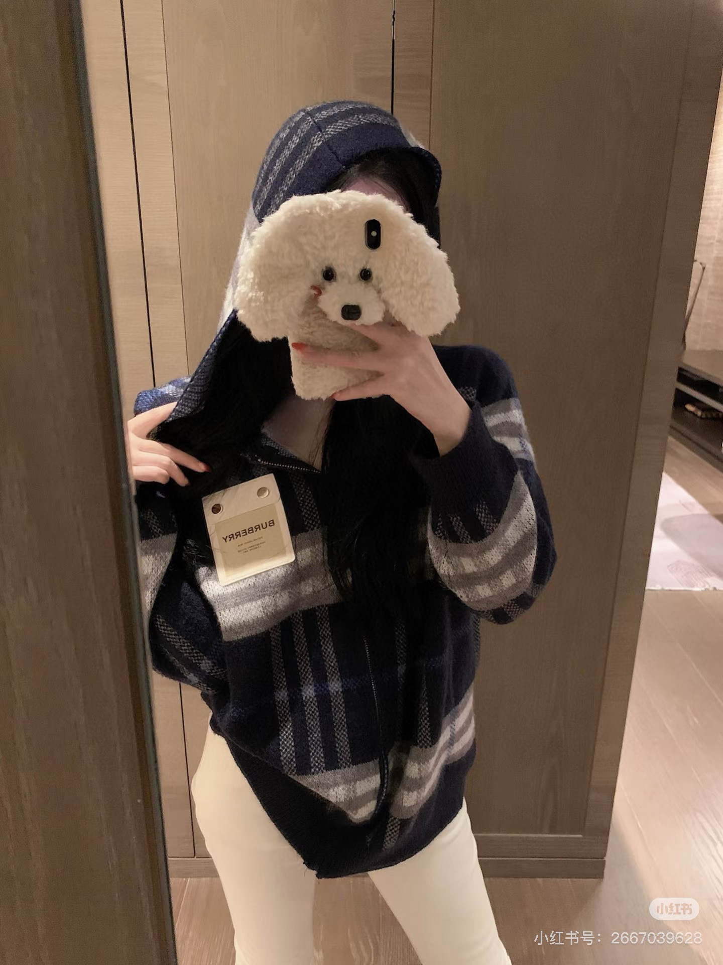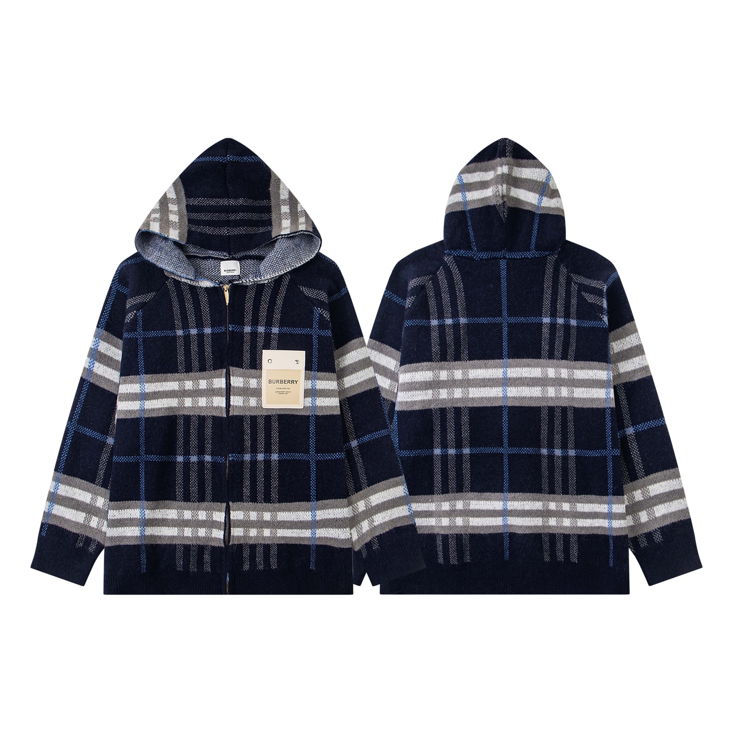 巴宝莉BURBERRY经典皮标拉链连帽蓝格子