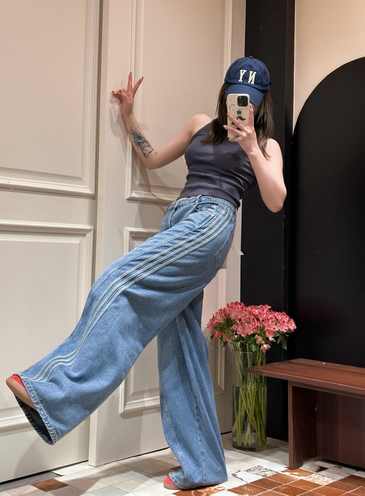 NY加绒刺绣织带直筒裤