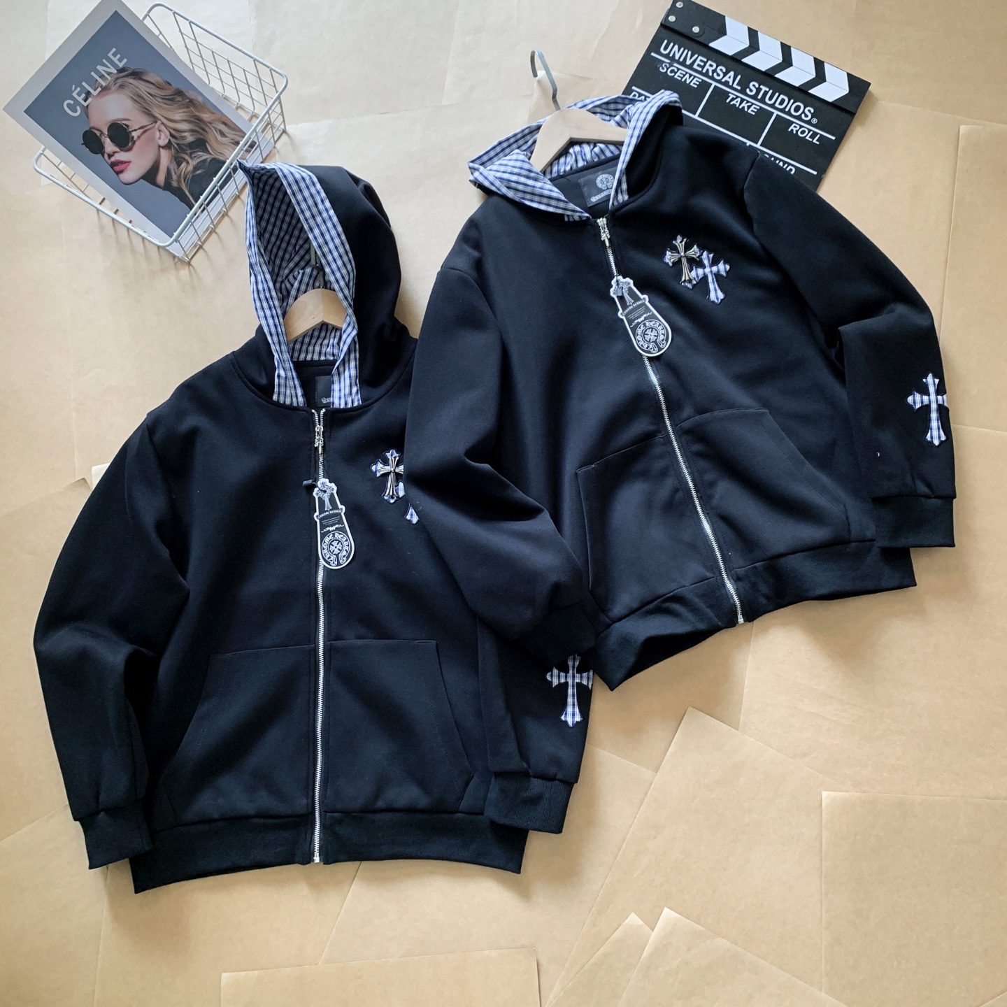 克罗心字母刺绣多皮标拉链连帽外套