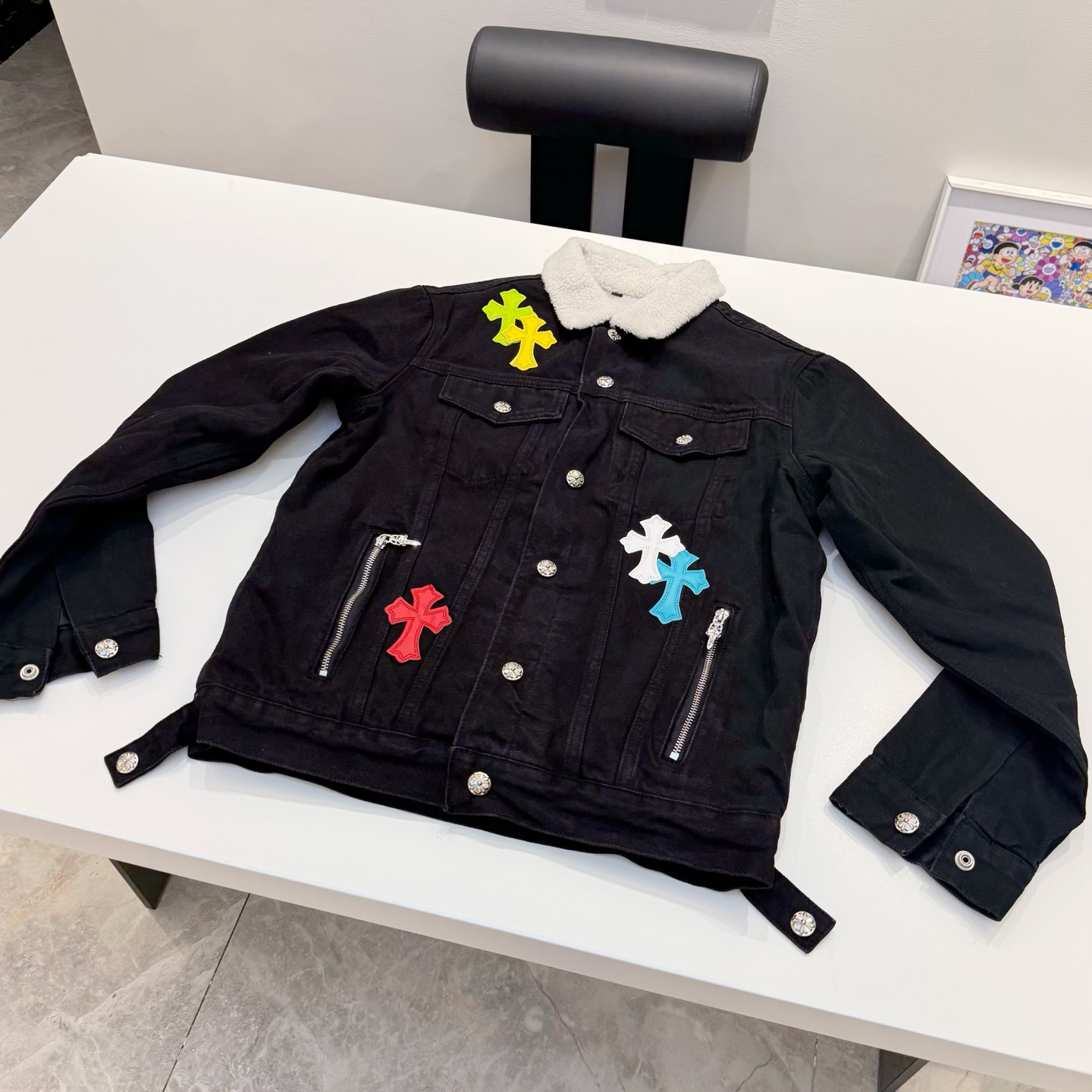 克罗心2025新款重工彩色十字架拼皮羊羔毛情侣款牛仔外套