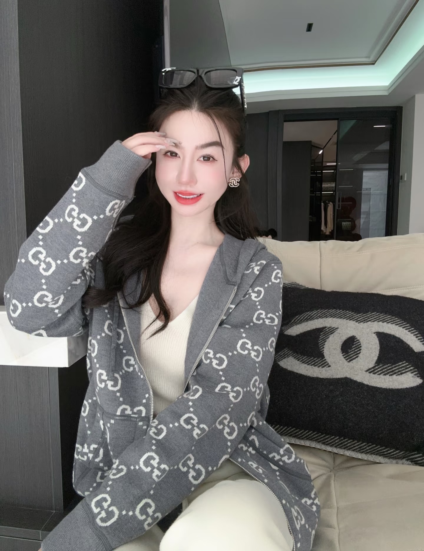 Gucci古驰新款羊毛双G满印提花logo连帽针织毛衣外套