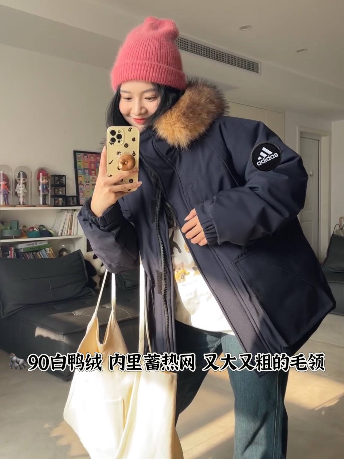 阿迪达斯Adidas藏青色户外风三防毛领派克羽绒服女秋冬新款 380493