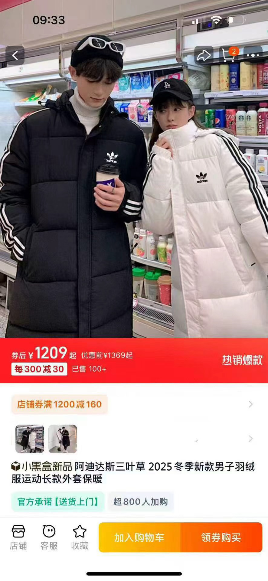 绒白鸭绒拼色Adidas 三叶草阿迪达斯情侣羽绒服