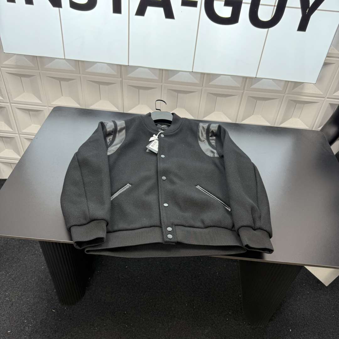 春季新款上新爆炸输出圣罗兰立领外套 拼接撞色皮革毛呢黑武士外 418135