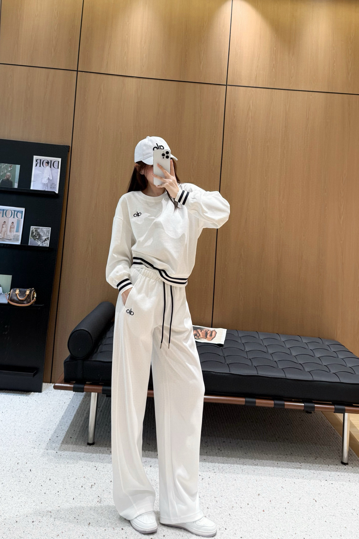 Alo字母刺绣条纹边圆领卫衣抽绳松紧腰长裤休闲套装
