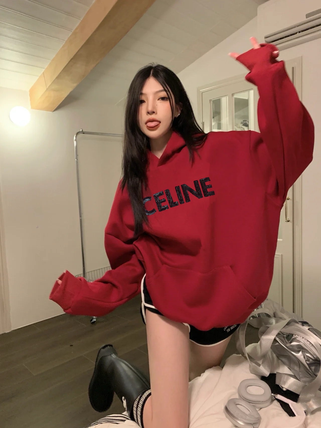Celine赛琳新款亮片刺绣酒红色加绒连帽卫衣