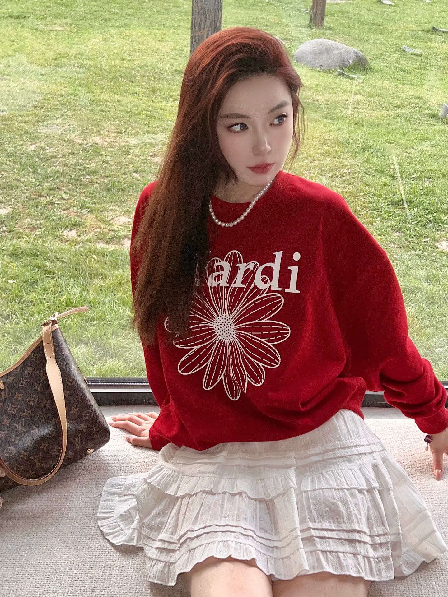 Mardi新款花朵雏菊图案大红色加绒圆领卫衣