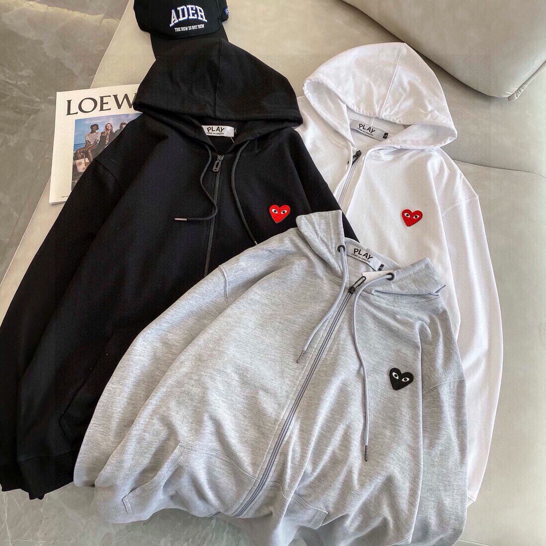 CDG川玖保玲专柜同款爱心刺绣标毛圈连帽拉链薄款卫衣外套火力 411092