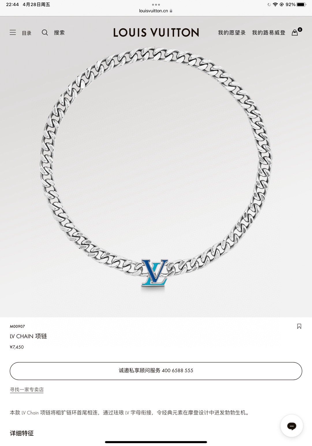 LV路易威登银色滴胶古巴项链 配全套包装