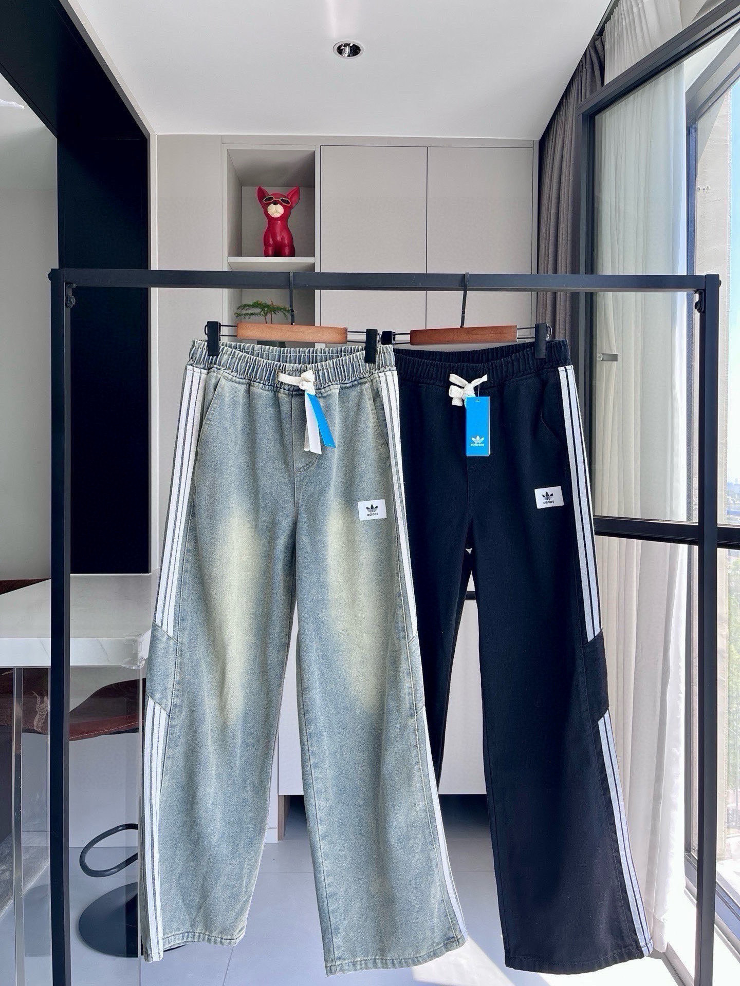 阿迪三条杠直筒裤
