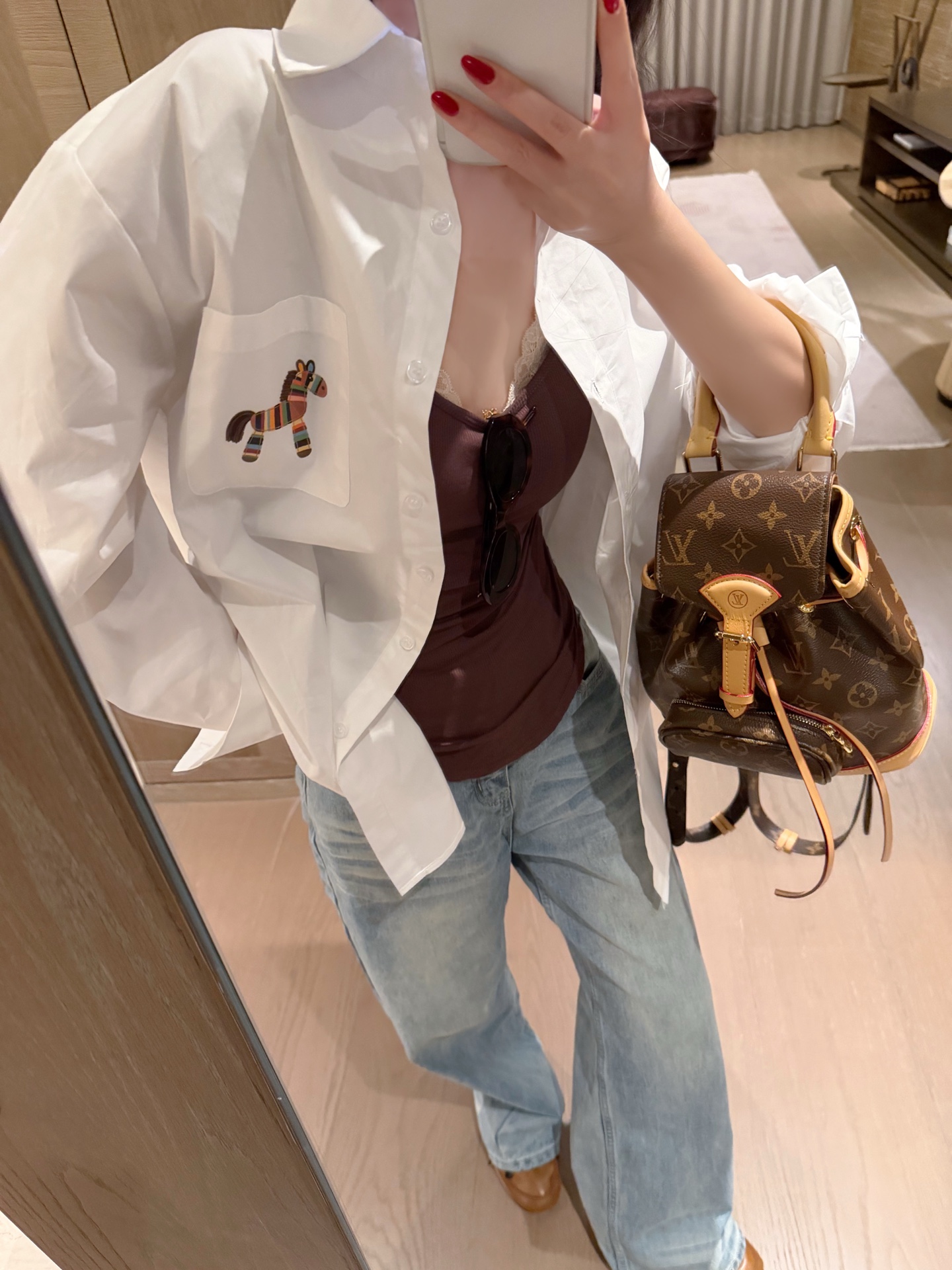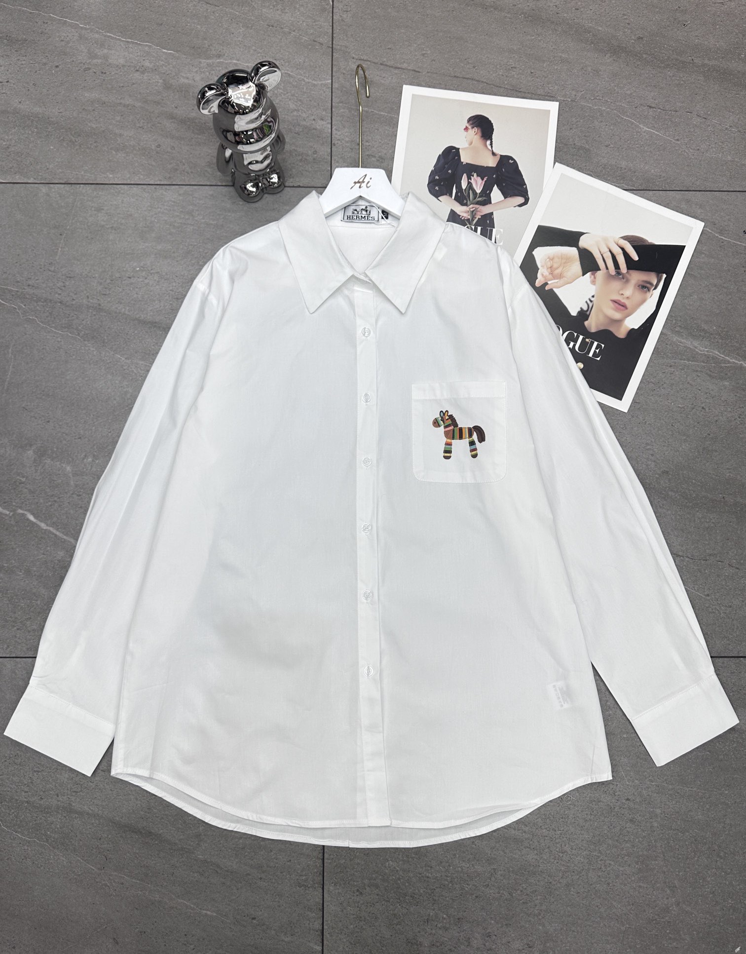 Hermes爱马仕前后彩色马印花烫钻翻领长袖衬衫