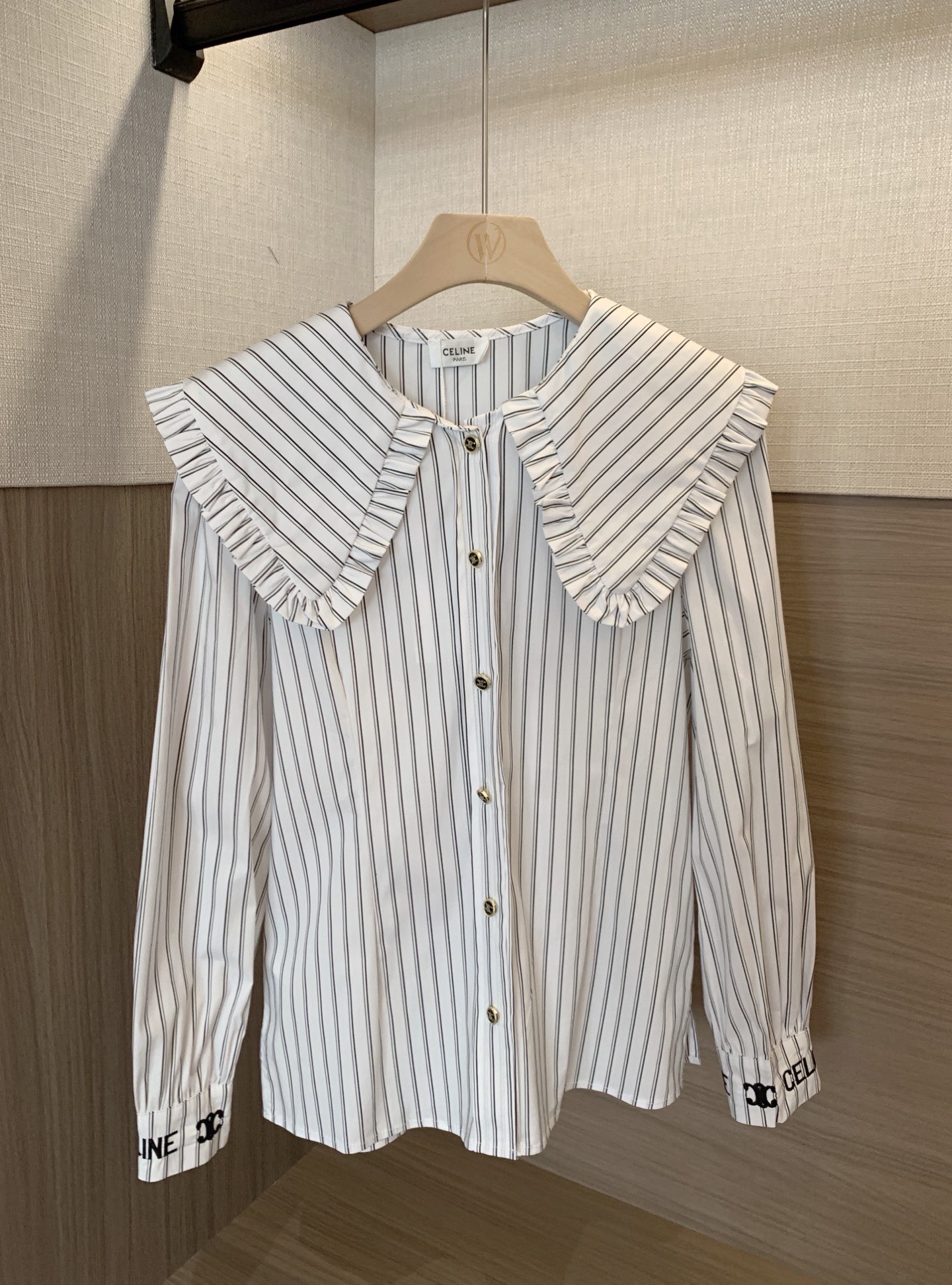 Celine赛琳字母刺绣定制凯旋门纽扣褶皱荷叶边翻领条纹衬衫 489795