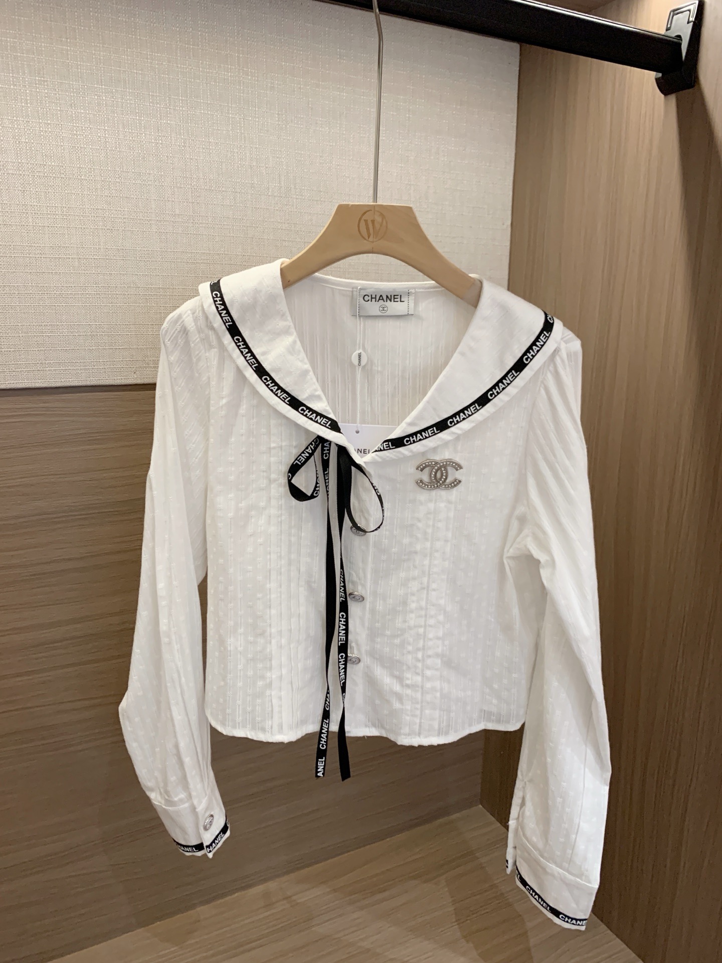 Chanel香奈儿小香定制字母织带定制双C纽扣短款衬衫配胸针 489799
