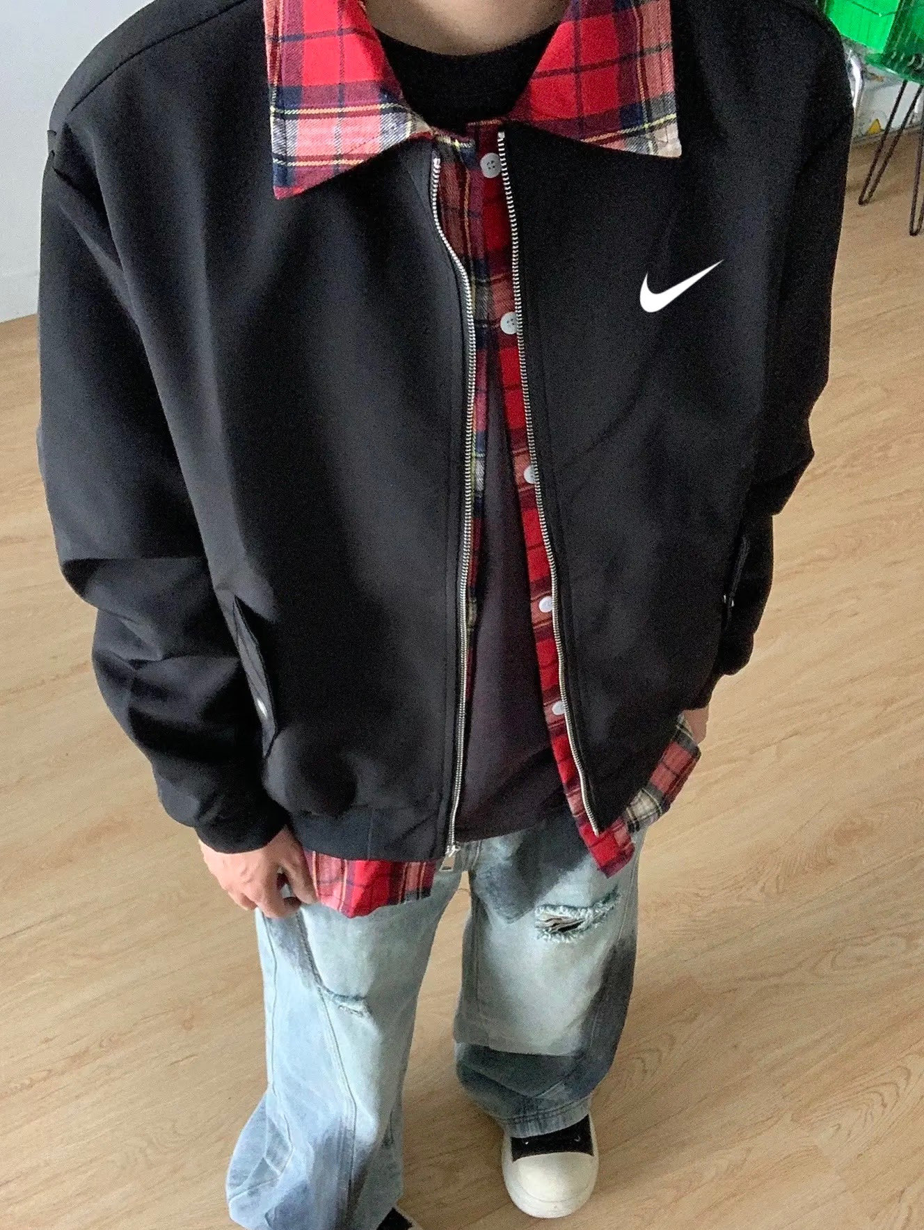 耐克Nike美式假俩件法兰绒红色衬衫ma1翻领夹克外套男女同 332026
