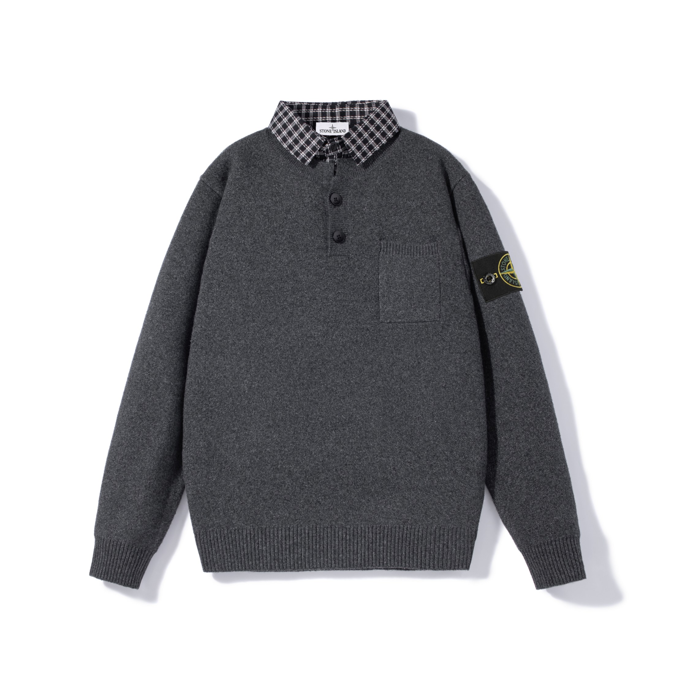 STONE ISLAND石头岛经典徽章口袋衬衫领假两件针织毛 416100