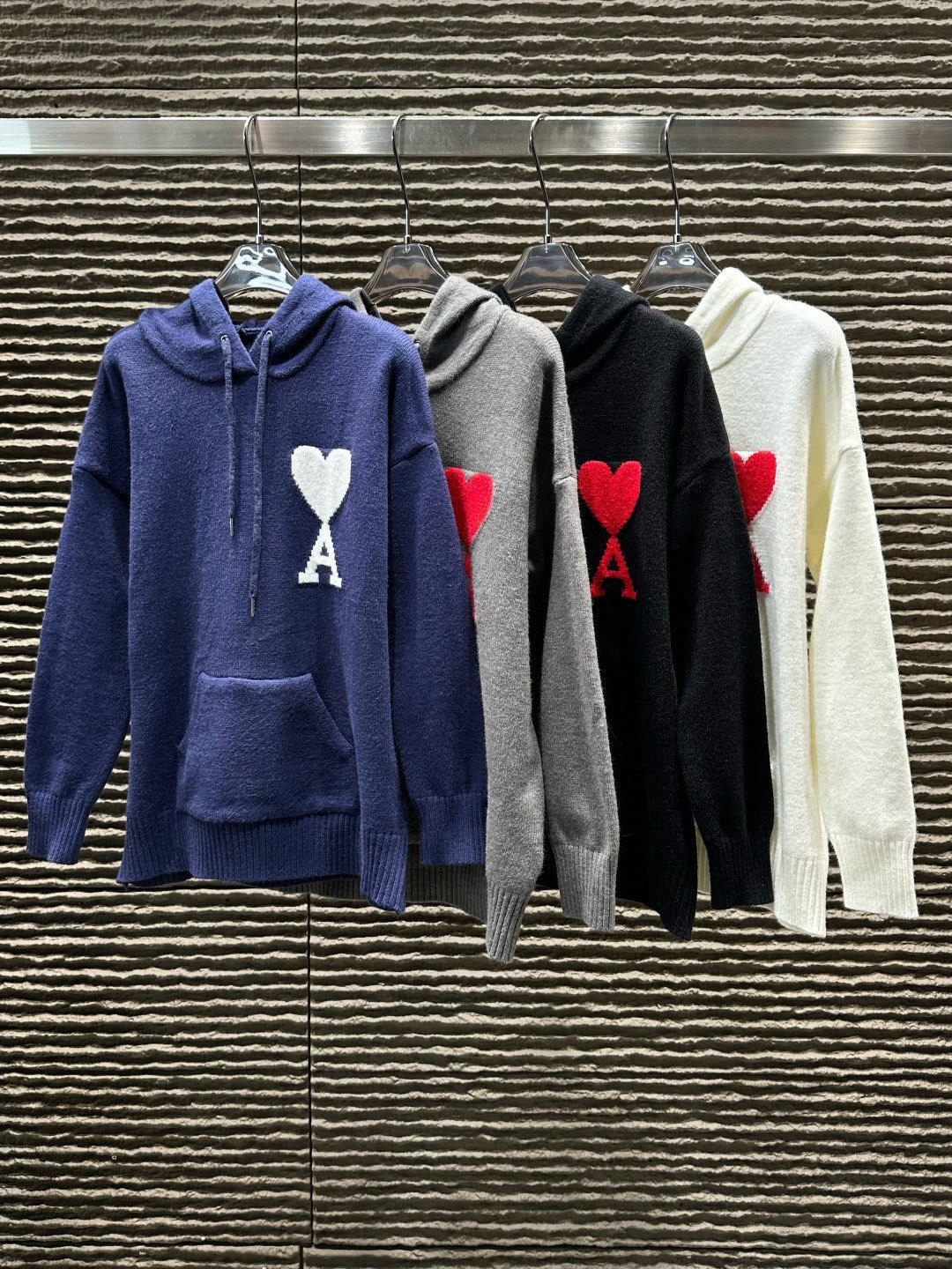 Ami经典A字爱心logo提花连帽长袖针织毛衣