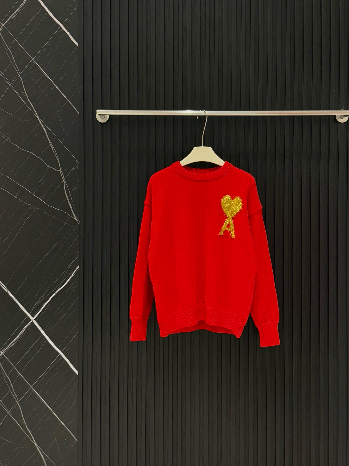 Ami经典A字爱心logo金色闪丝提花圆领长袖套头针织毛衣