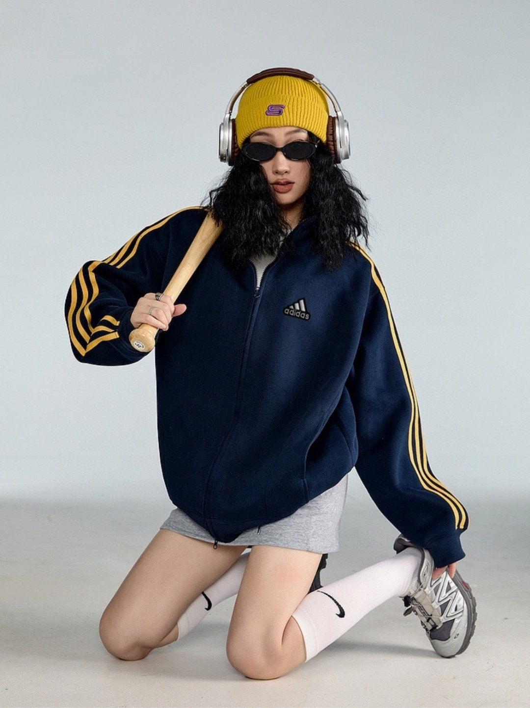 新款阿迪达斯Adidas美式藏青色黄色三条杠开衫卫衣情侣穿搭 335840