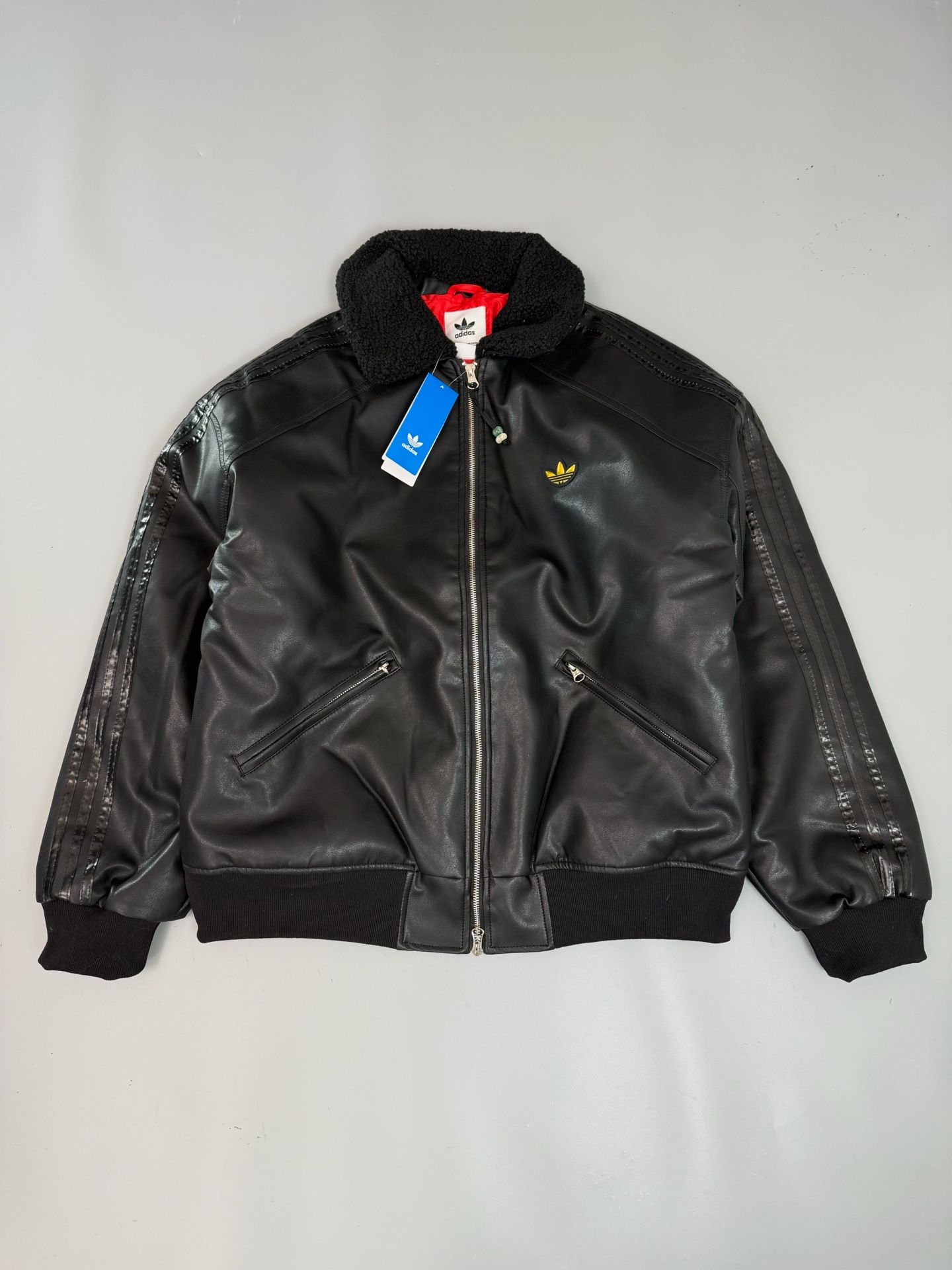 代发 Adidas阿迪达斯三叶草仿皮翻领美式复古翻领皮衣棉服 396803