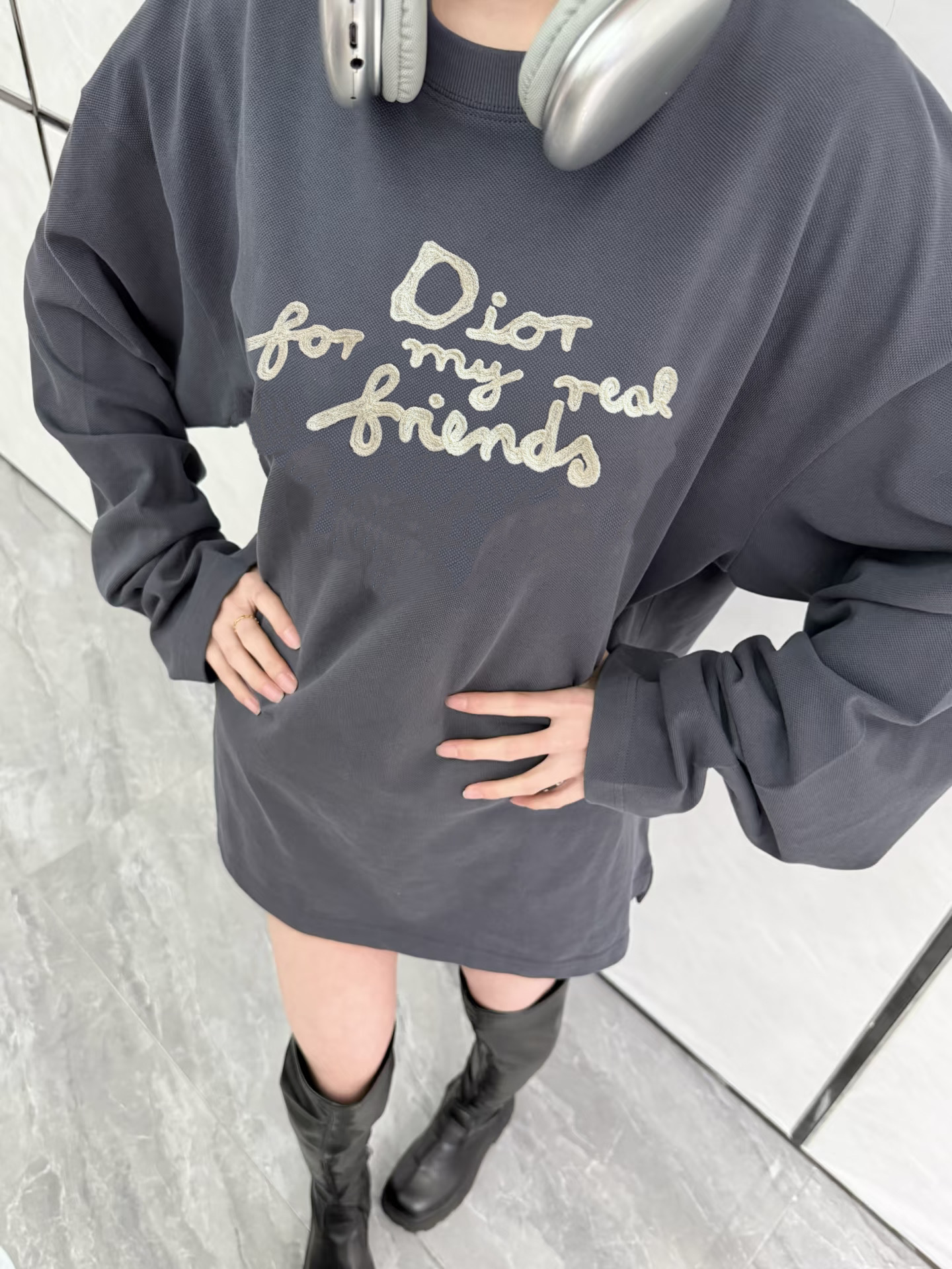 Dior迪奥新款草写字母刺绣logo碳灰色圆领卫衣