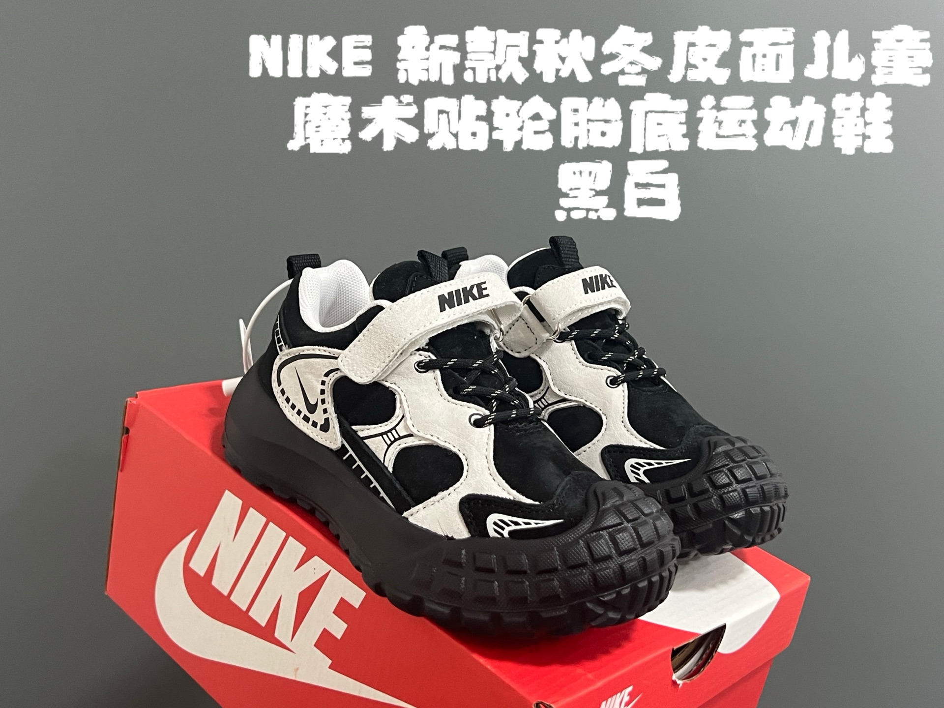 NK新款秋冬皮面儿童魔术贴轮胎底运动鞋