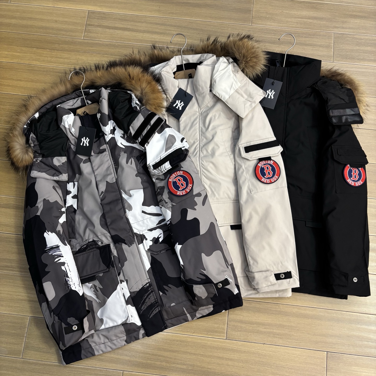 MLB 洋基队魔法棒大标带毛字母连帽工装中长款羽绒服