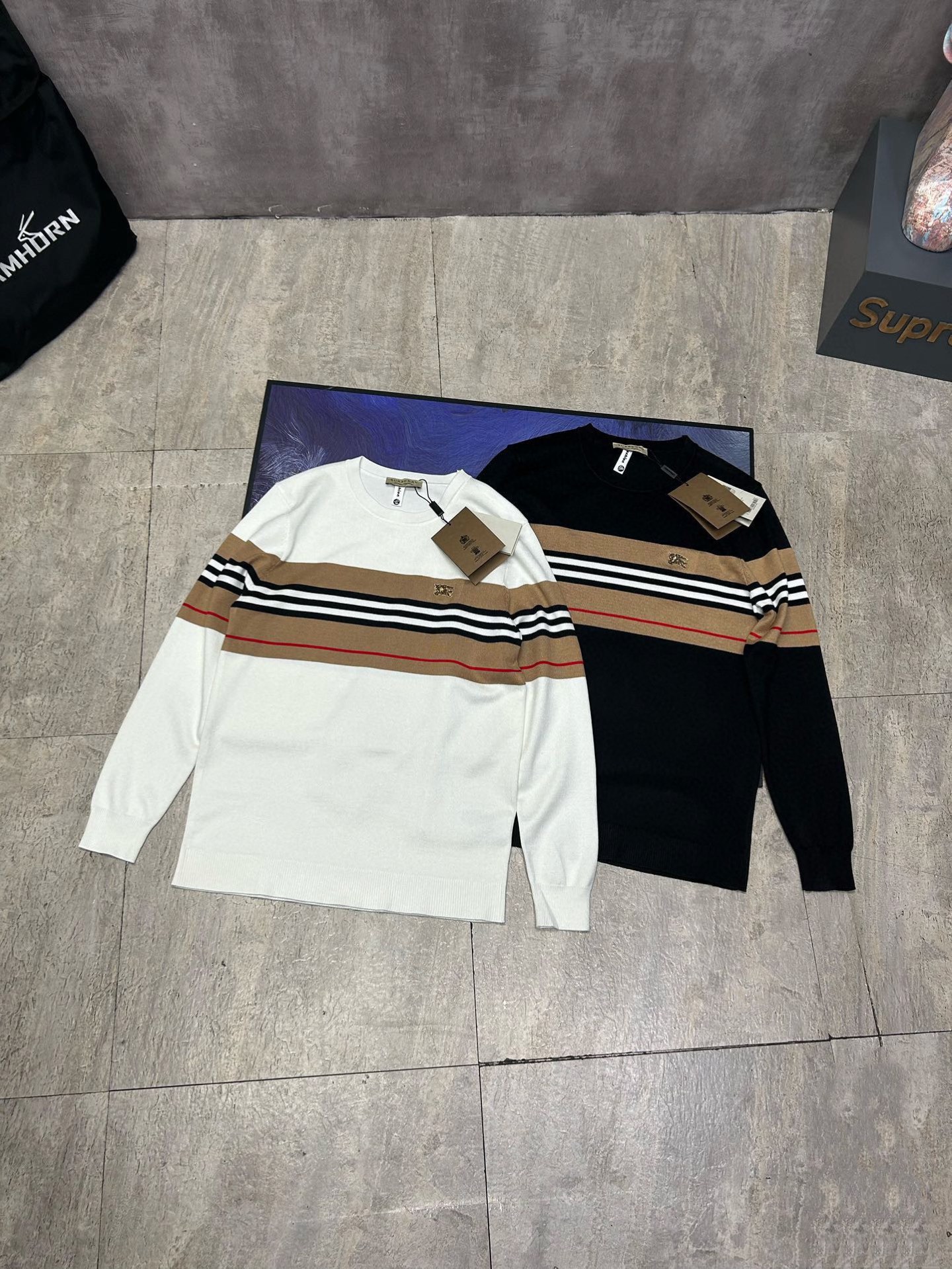 新款巴宝莉战马镶钻条纹圆领针织毛衣