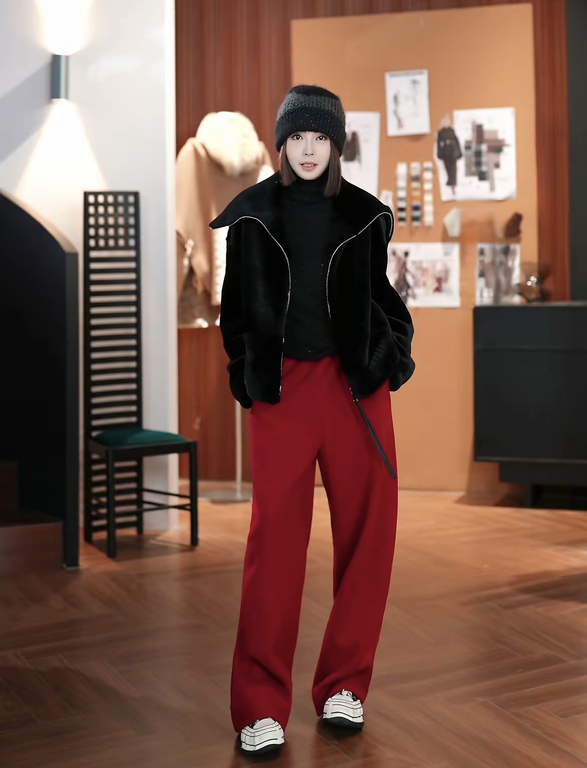 热门圣诞新年必备 冬季新款加绒加厚拉腿显瘦红色羊毛阔腿裤