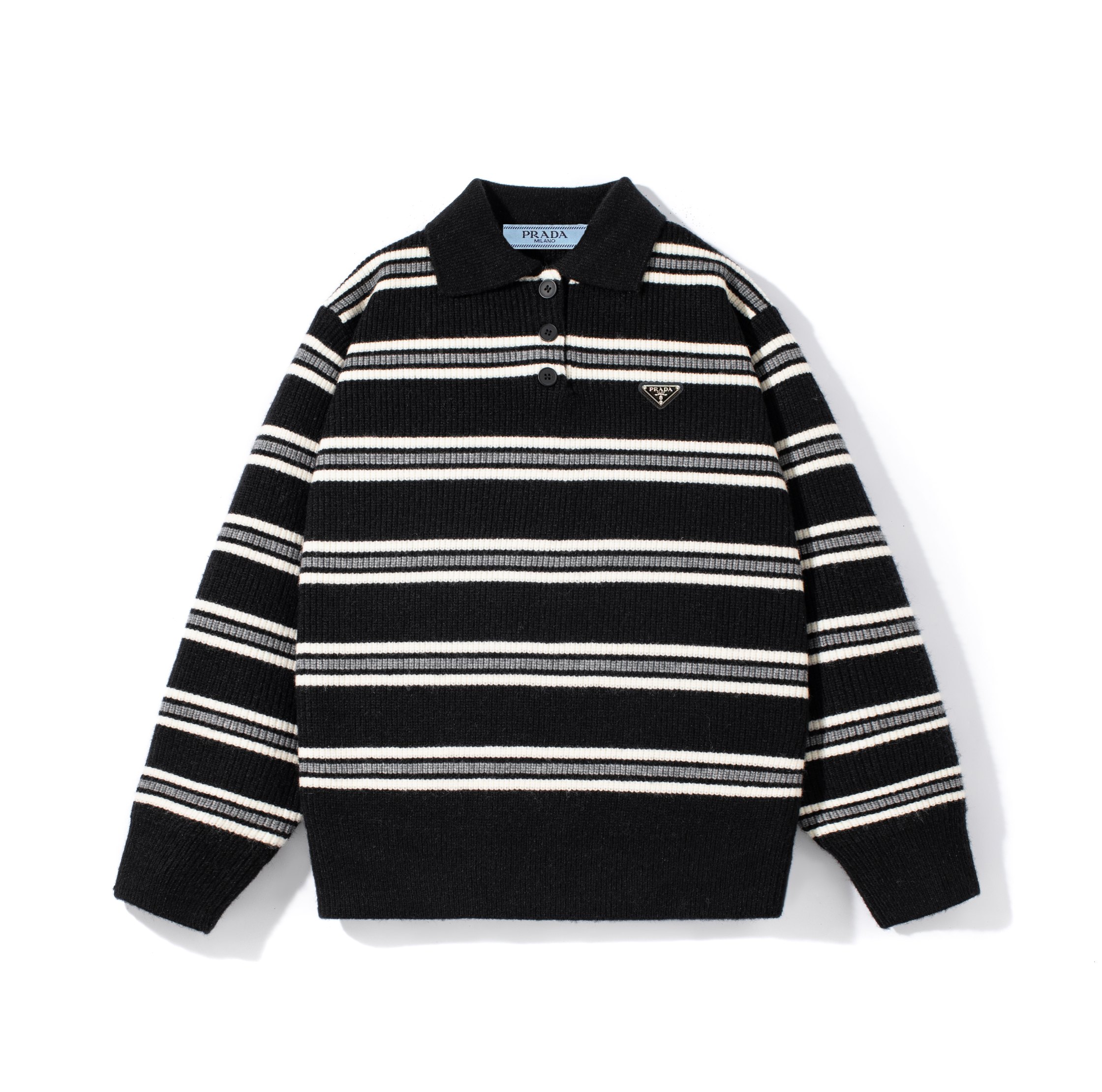 Prada普拉达经典三角皮标翻领条纹针织毛衣