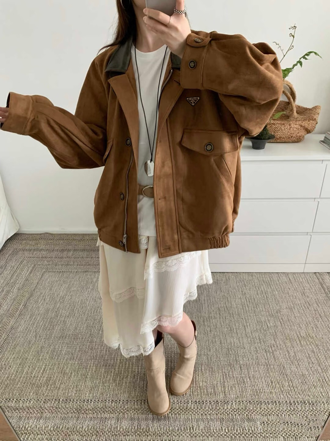Prada 普拉达秋季中古风麂皮绒撞色拼接翻领夹克外套