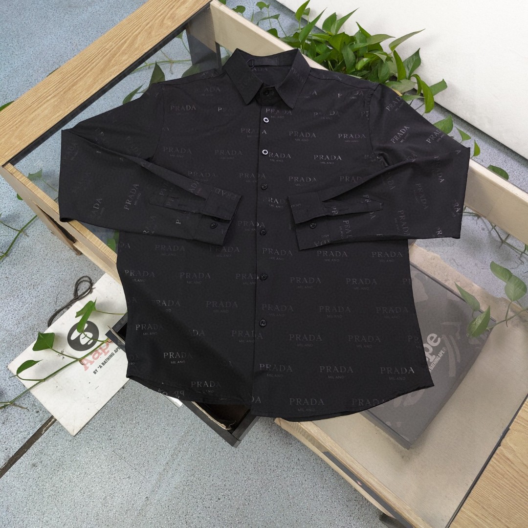 prada普拉达新款毛呢金属三角标黑色衬衫外套