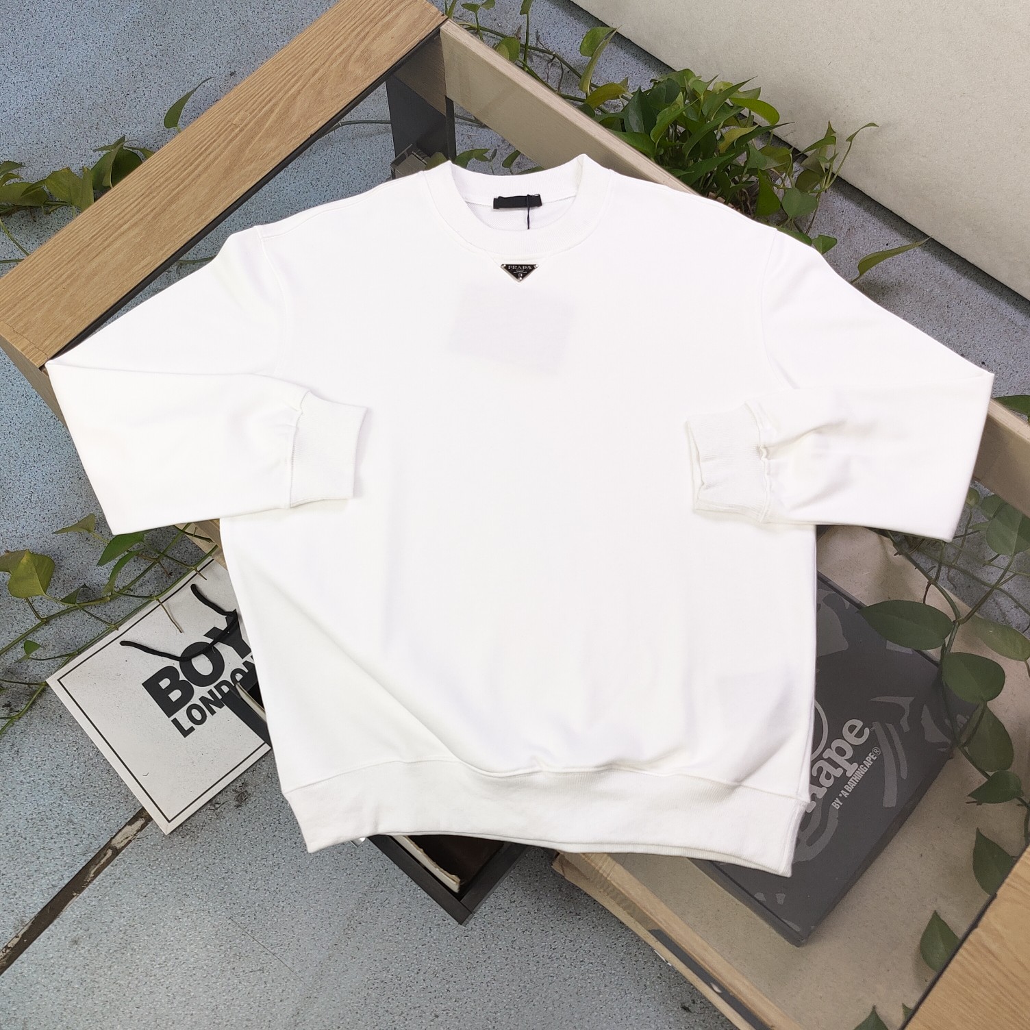普拉达胸前三角标logo徽标拼色V字圆领卫衣