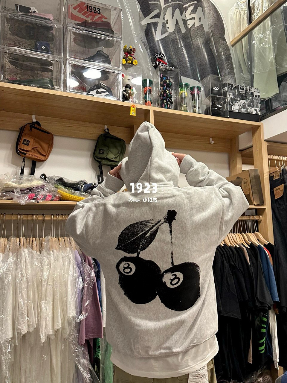 Stussy 斯图西樱桃袋鼠口袋冬季加绒重磅连帽卫衣