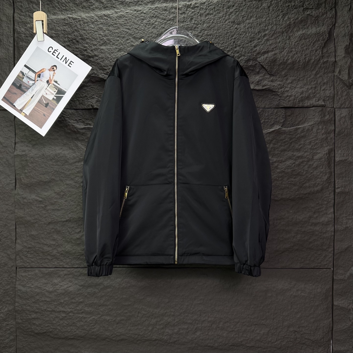 普拉达2025新款金色三角徽章情侣款连帽拉链外套