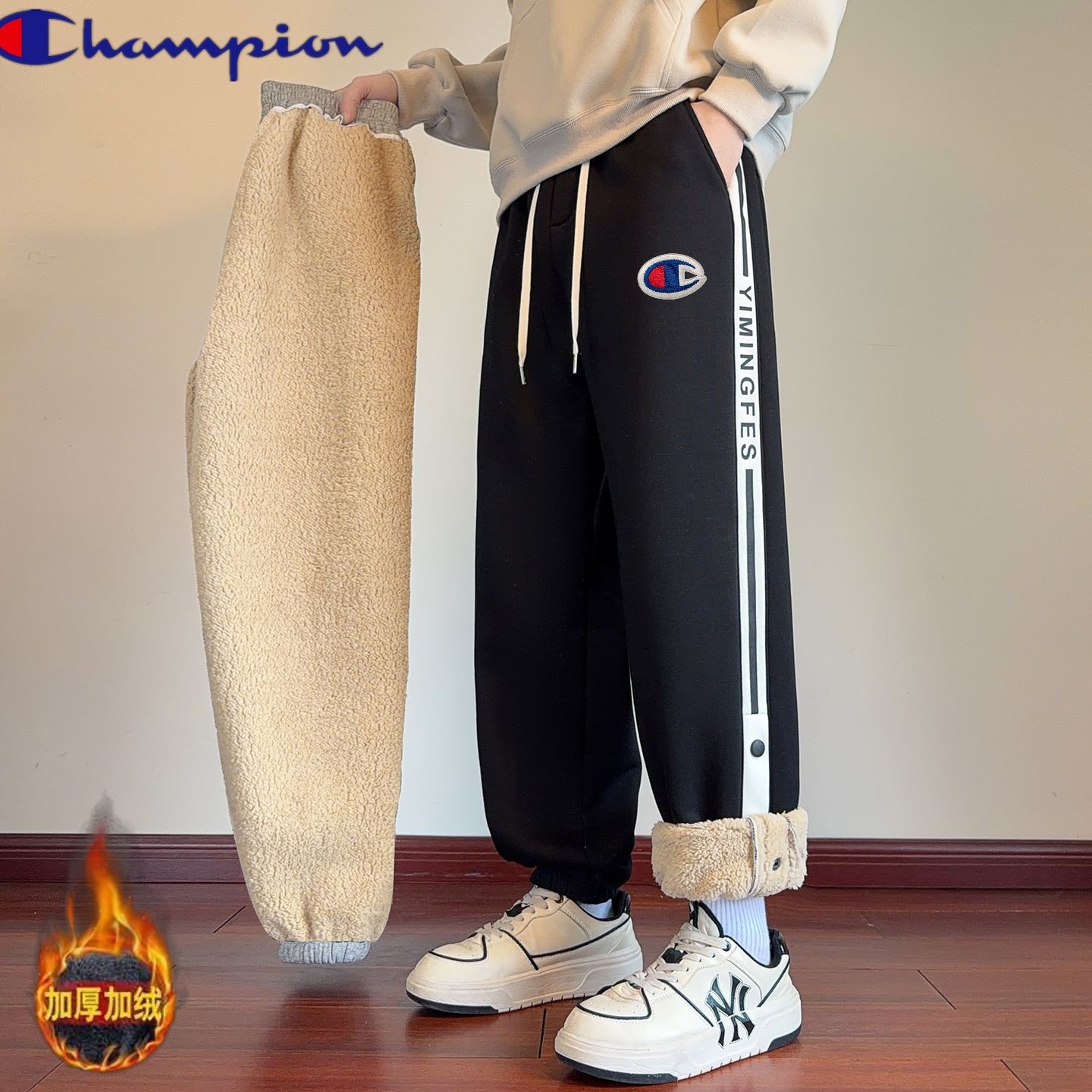 冠军champion冬季新款 男女同款松紧腰加绒加厚百搭侧边 428947