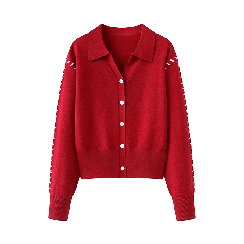 批法式红色设计感翻领针织开衫女2025新款新年软糯毛衣上衣 393578