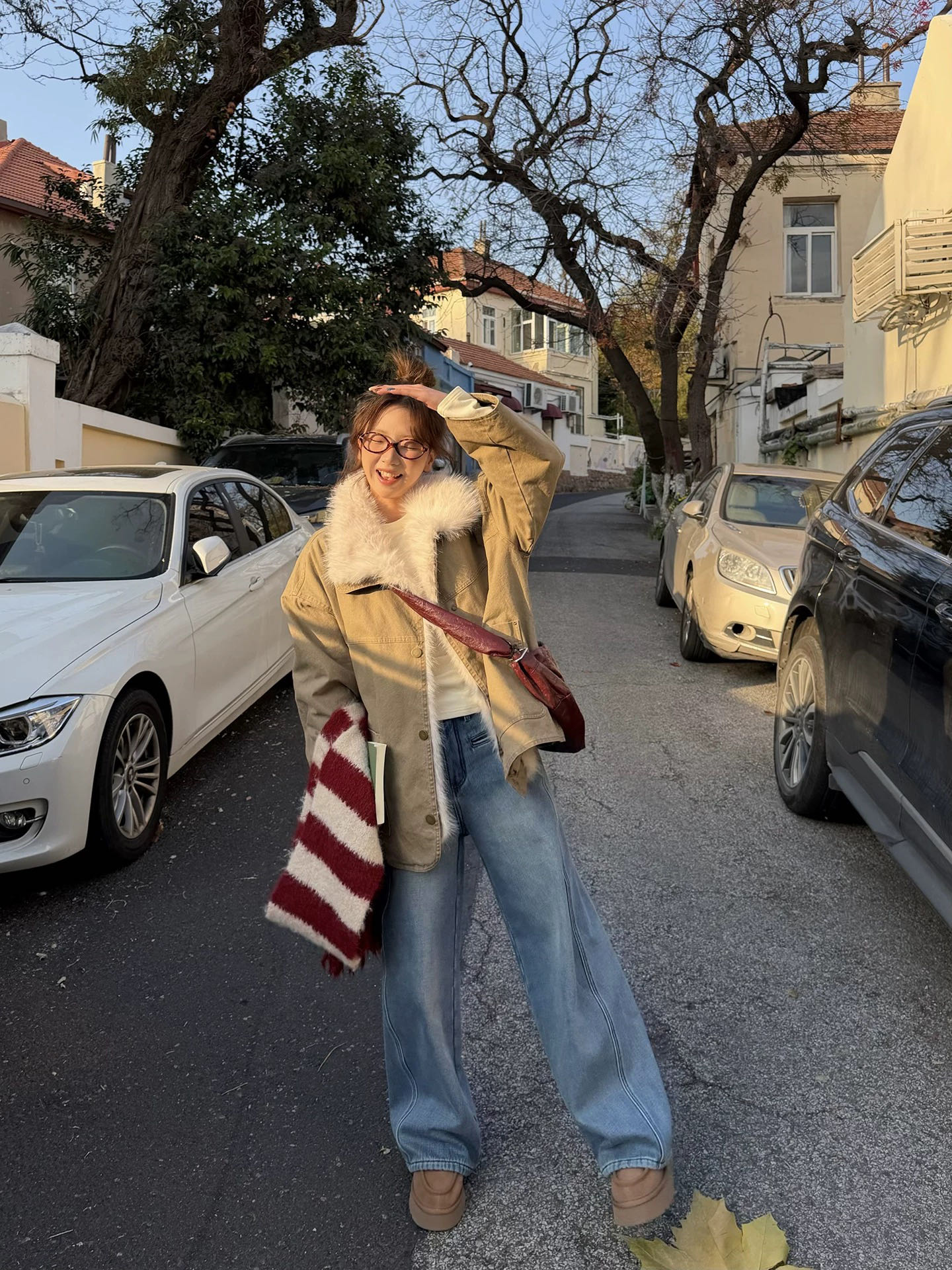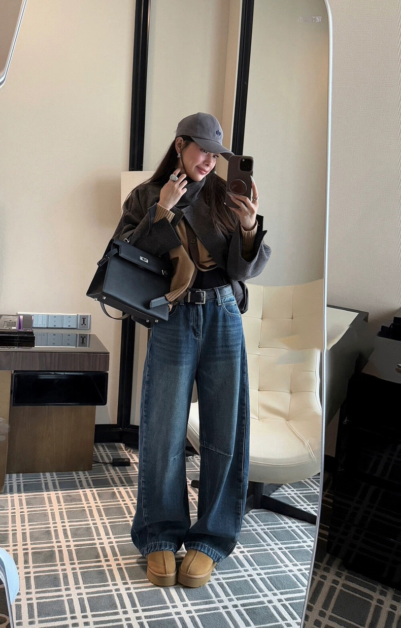 杨幂同款冬季加绒加厚保暖弯刀牛仔裤高腰显瘦宽松阔腿裤 配腰带 423154