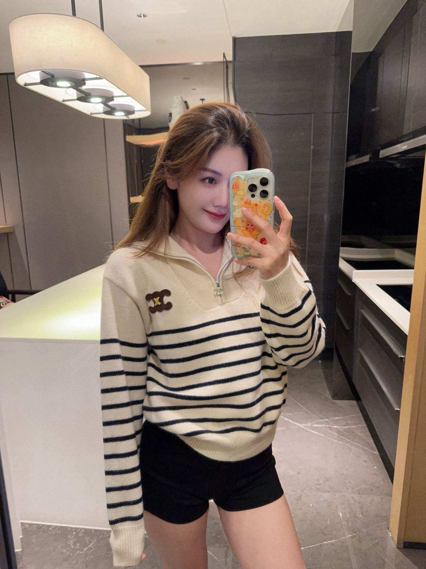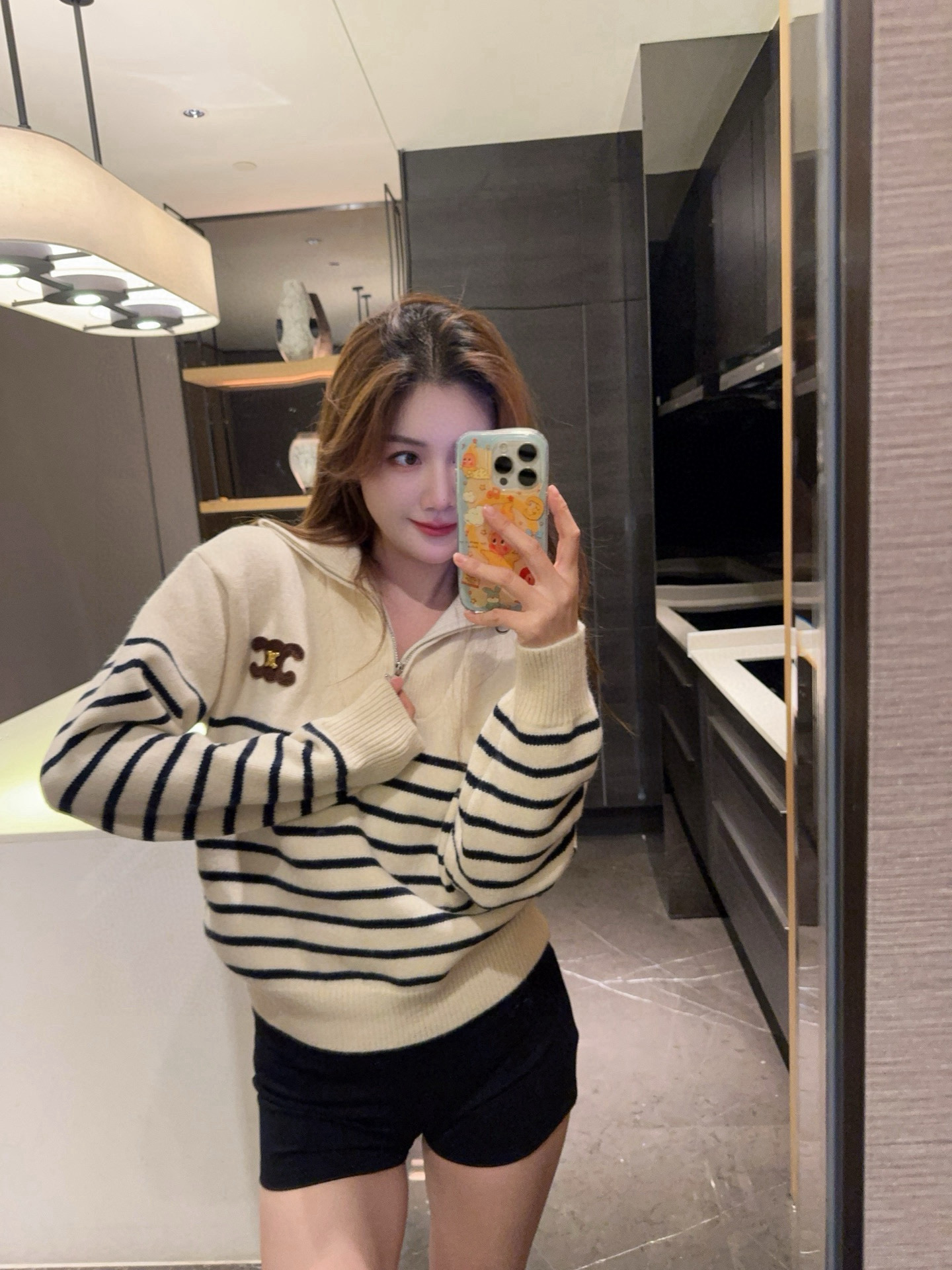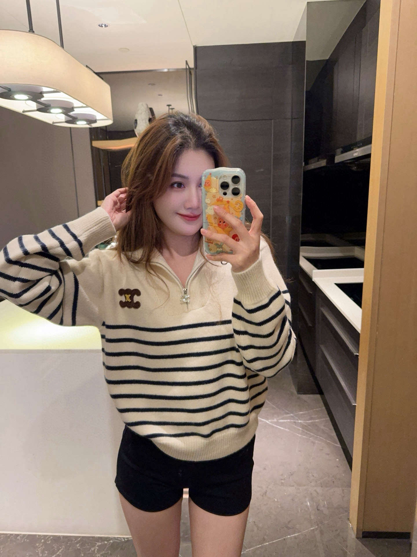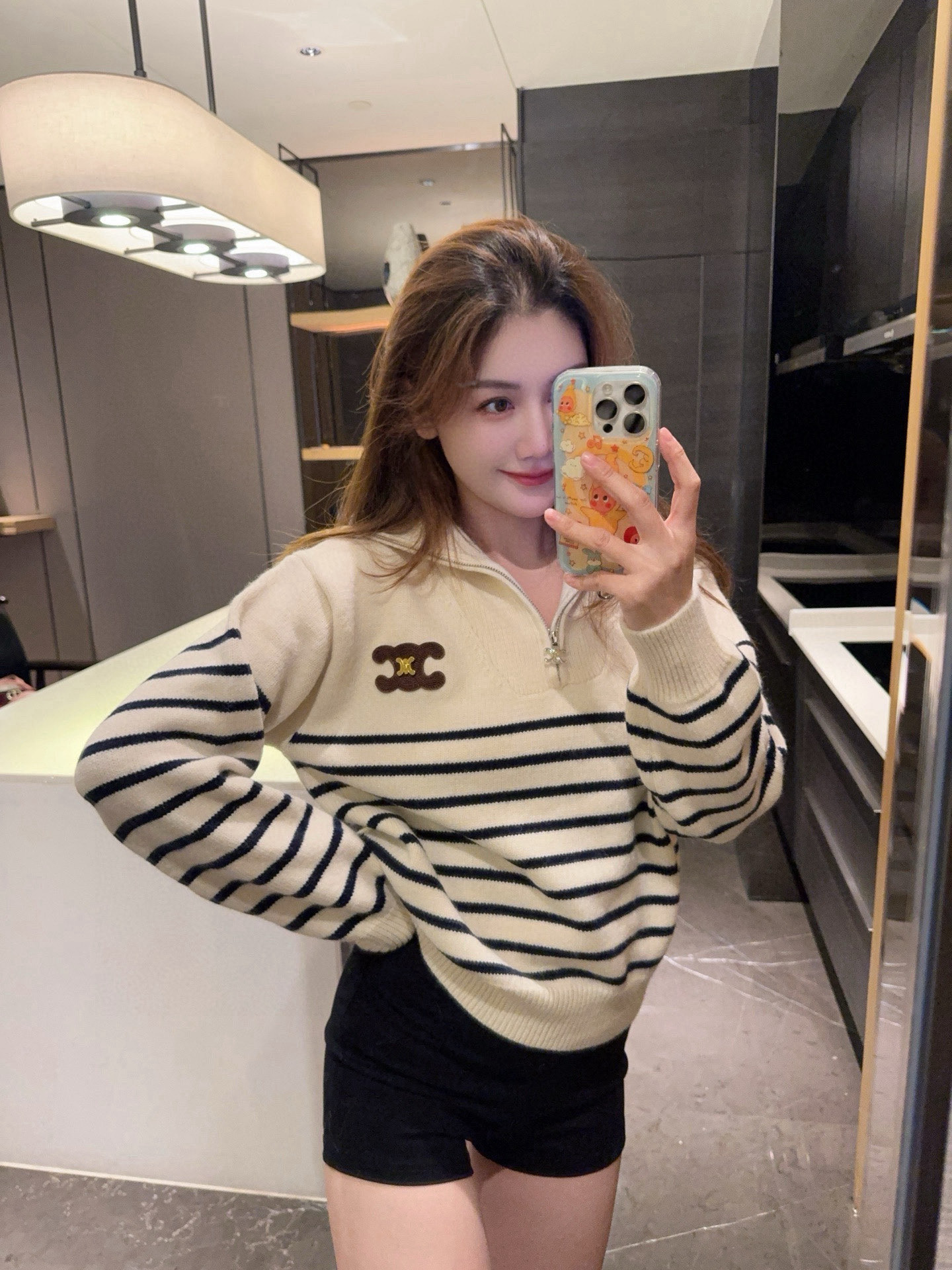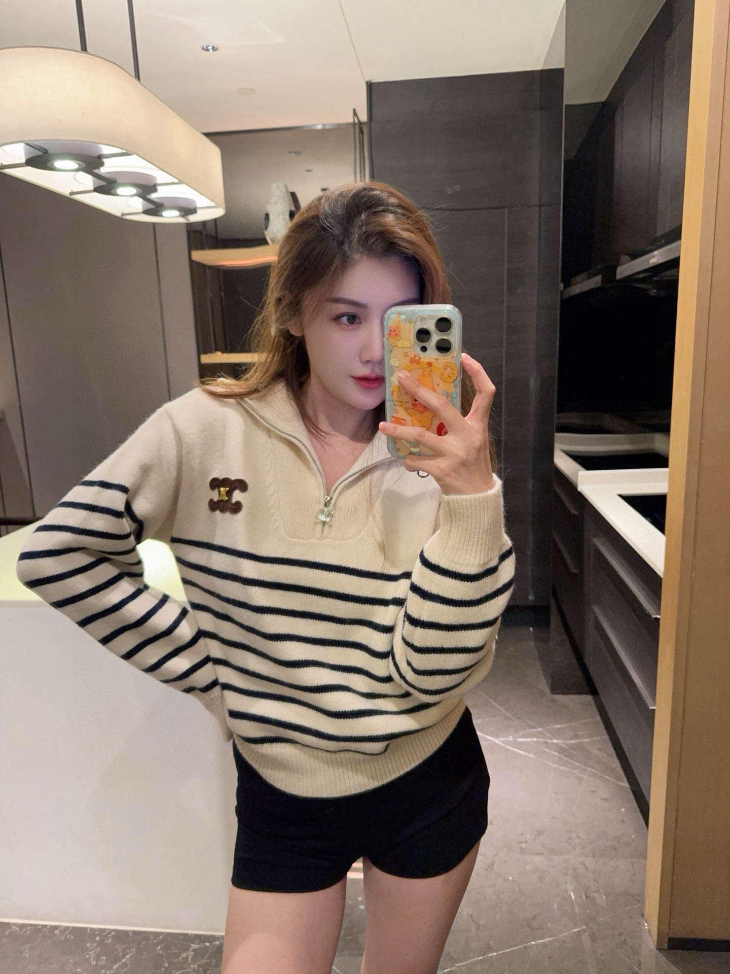 Celine赛琳金属刺绣凯旋门定制半拉链条纹针织毛衣