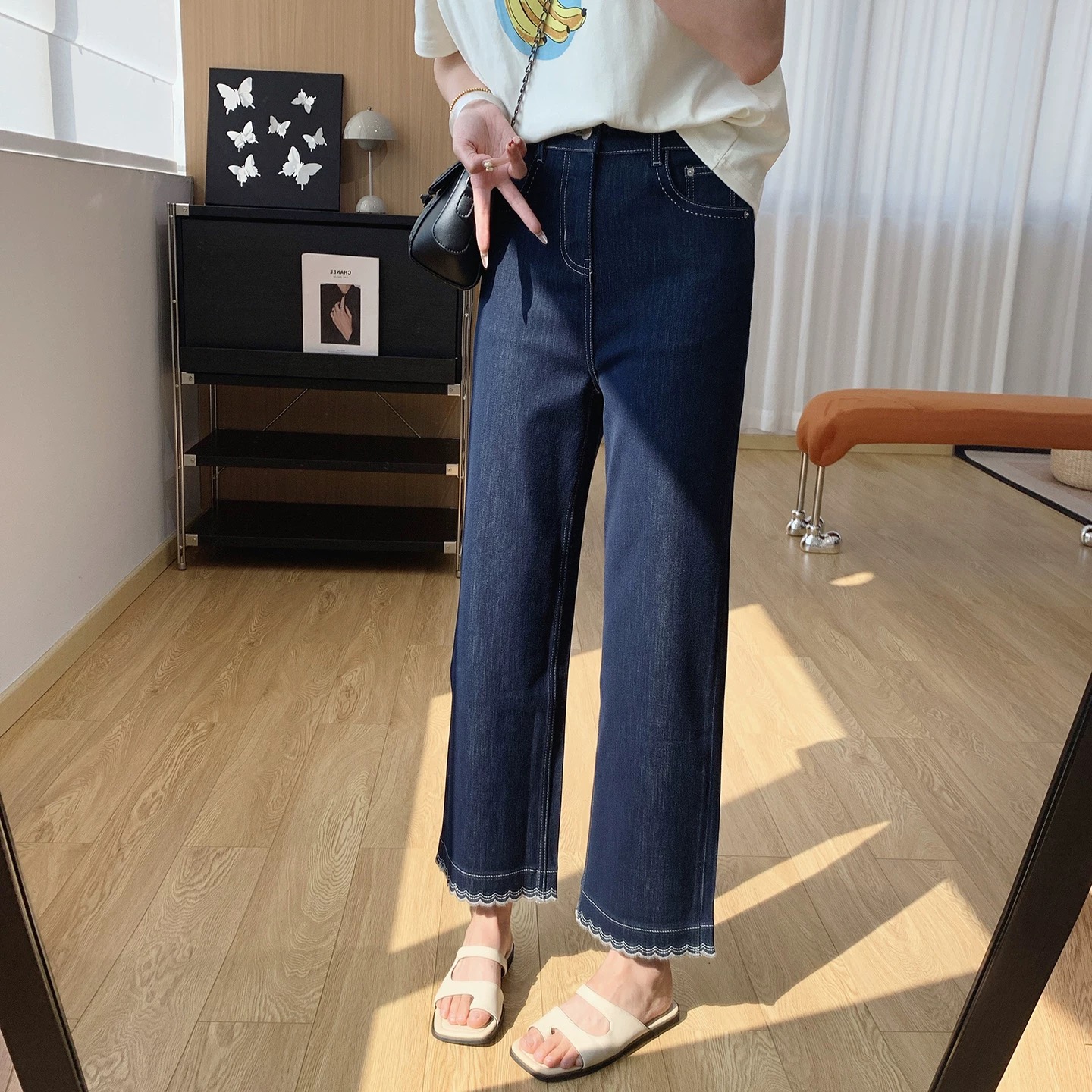 裤脚波浪纹刺绣裤边 甜而不腻 一 miao提升jing致感 篙腰 微宽松直筒 胯 肉 修饰腿型
