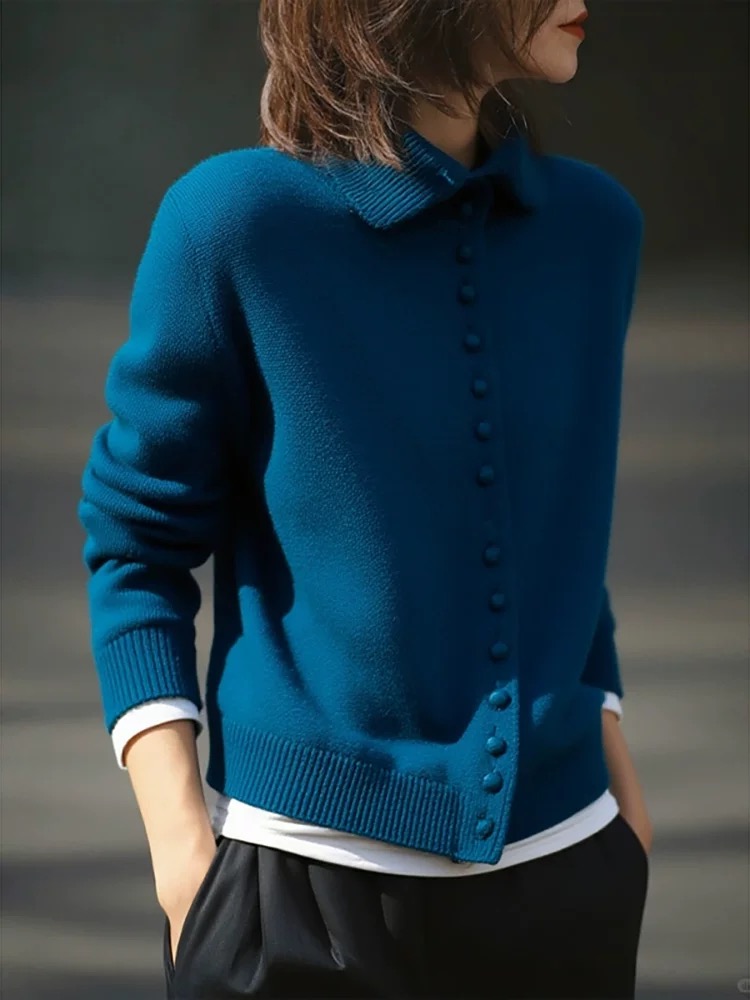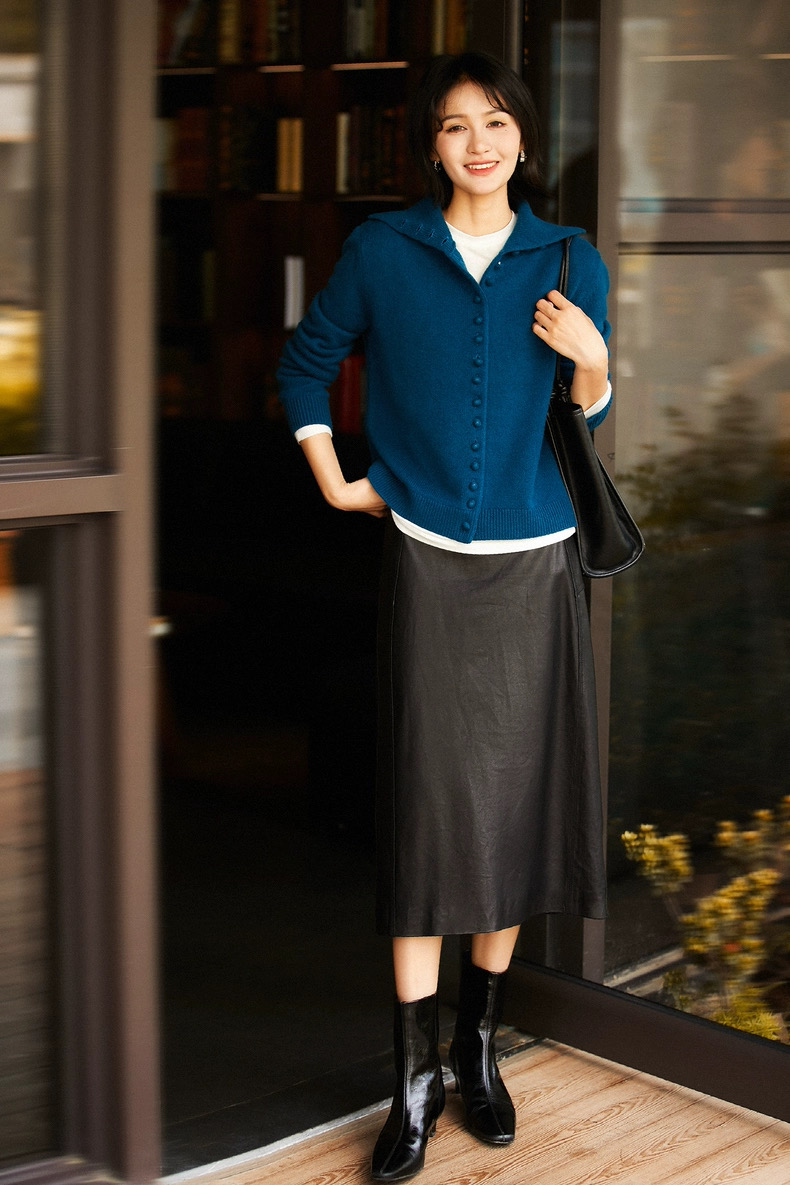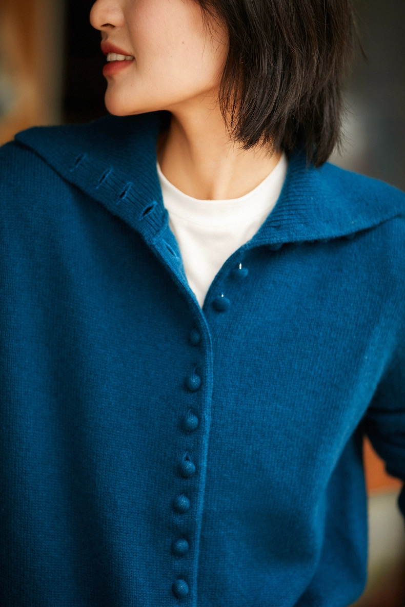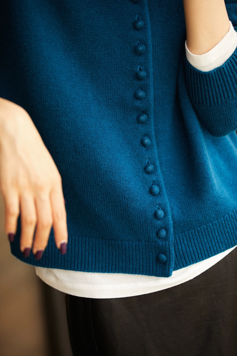 孔雀蓝 冬季新款松软羊毛可立领可翻领纽扣针织开衫毛衣