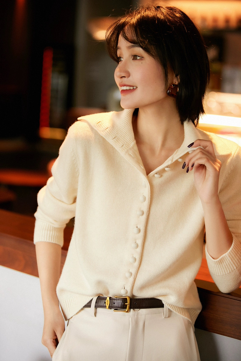 整体采用偏短款剪裁 利落明快 与袖长形成落差对比 拉高腰线显高显瘦 表面坑条螺纹肌理增加横向弹力 穿着轻松无束缚感 袖口和下摆做了罗纹收口更显利落 而且罗纹织法的稳定性会更好 这样穿着和清洗的时候也不用担心变形问题 纽扣选用与织物相同的纱线手工包裹制成 整体色调与质感保持一致 门襟处纽扣一路延伸至颈部 可根据穿着需求灵活调整领型 既可全扣呈现为包覆性良好的立领造型 增强防风与收束感 亦可敞开翻折 转化为翻领状态 更添松弛气息与造型层次 两种领型切换自如 兼顾实用性与风格变化 为日常穿搭提供更多可能性 无论做打底叠穿还是单穿 都能烘托简约时尚感