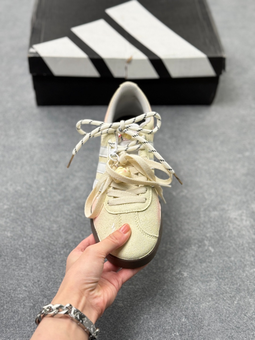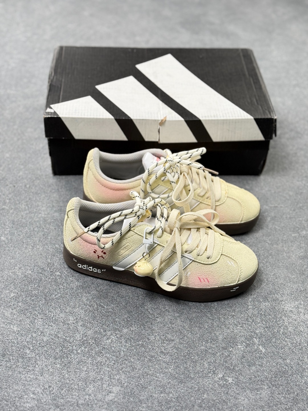 软 fufu 的奶黄底色晕着粉调 鞋身小哭脸 手绘线条是藏不住的甜丧感 麻绳鞋带 琥珀挂饰直接把细节拉满 HQ1802 这双 搭卫衣是慵懒甜妹 搭百褶裙是软萌酷盖 春天穿它出门连风都是甜的