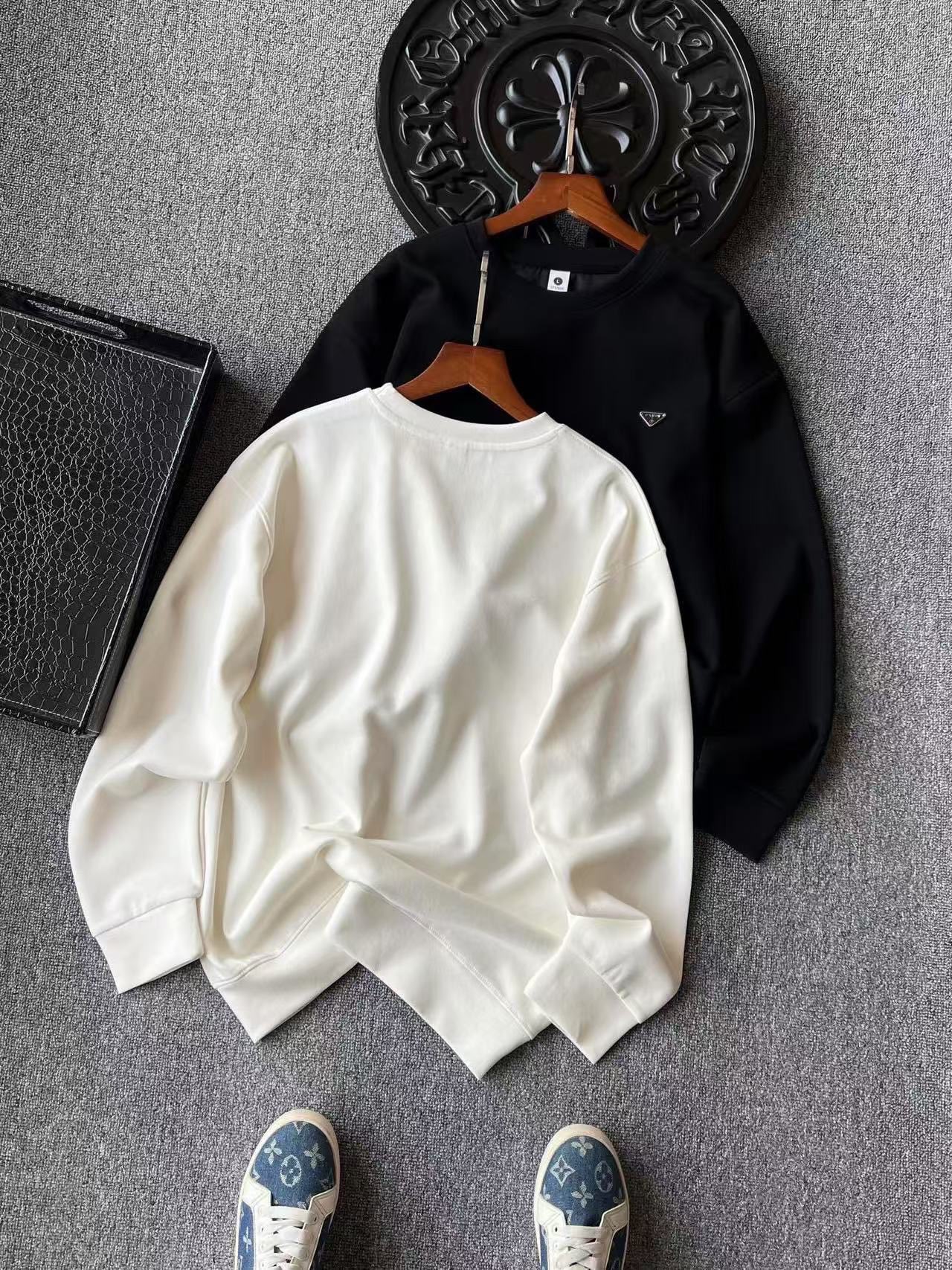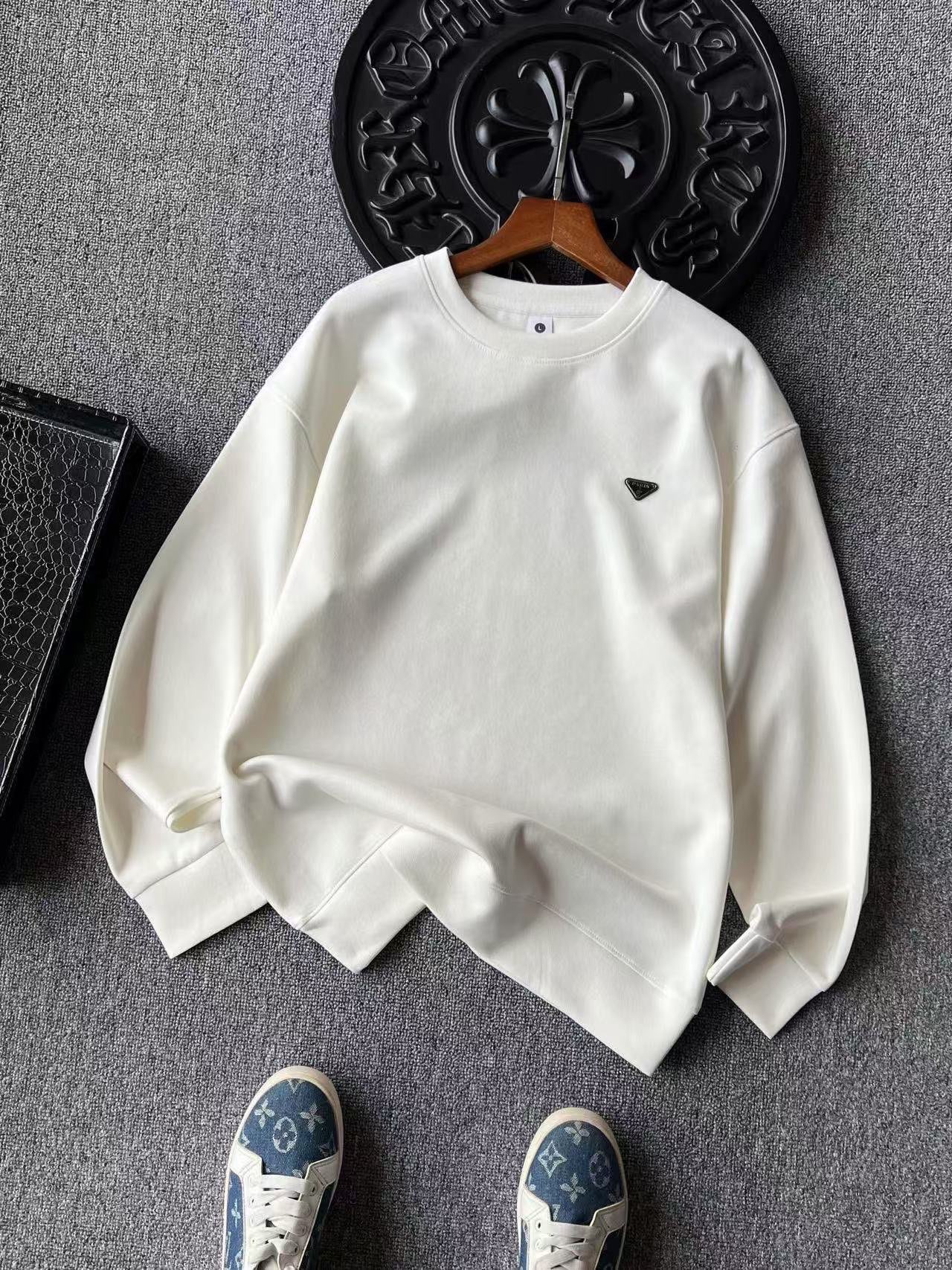 细节细节再细节 Prada家公文包系专柜新品高奢圆领卫衣 全身精致简约 纯正牛奶白 石墨黑 水泥灰以及摩卡色 胸前钨钢金属亚格力Paris巴黎小仆人公文包限定标识 轮廓镶嵌立体硅胶包边 十分精细 所有拼接接缝处全部做了双针压线 精湛做工天花板