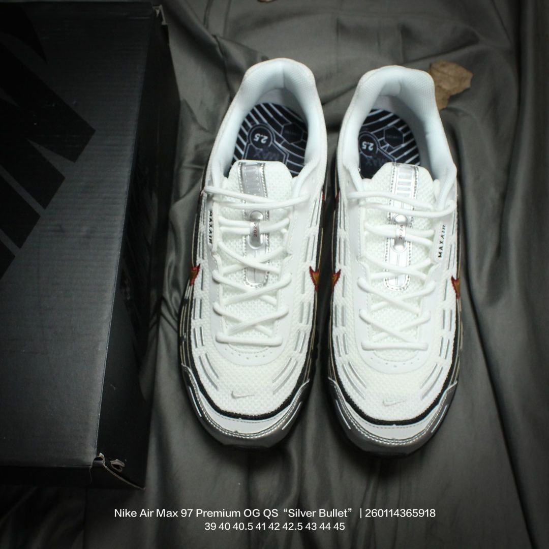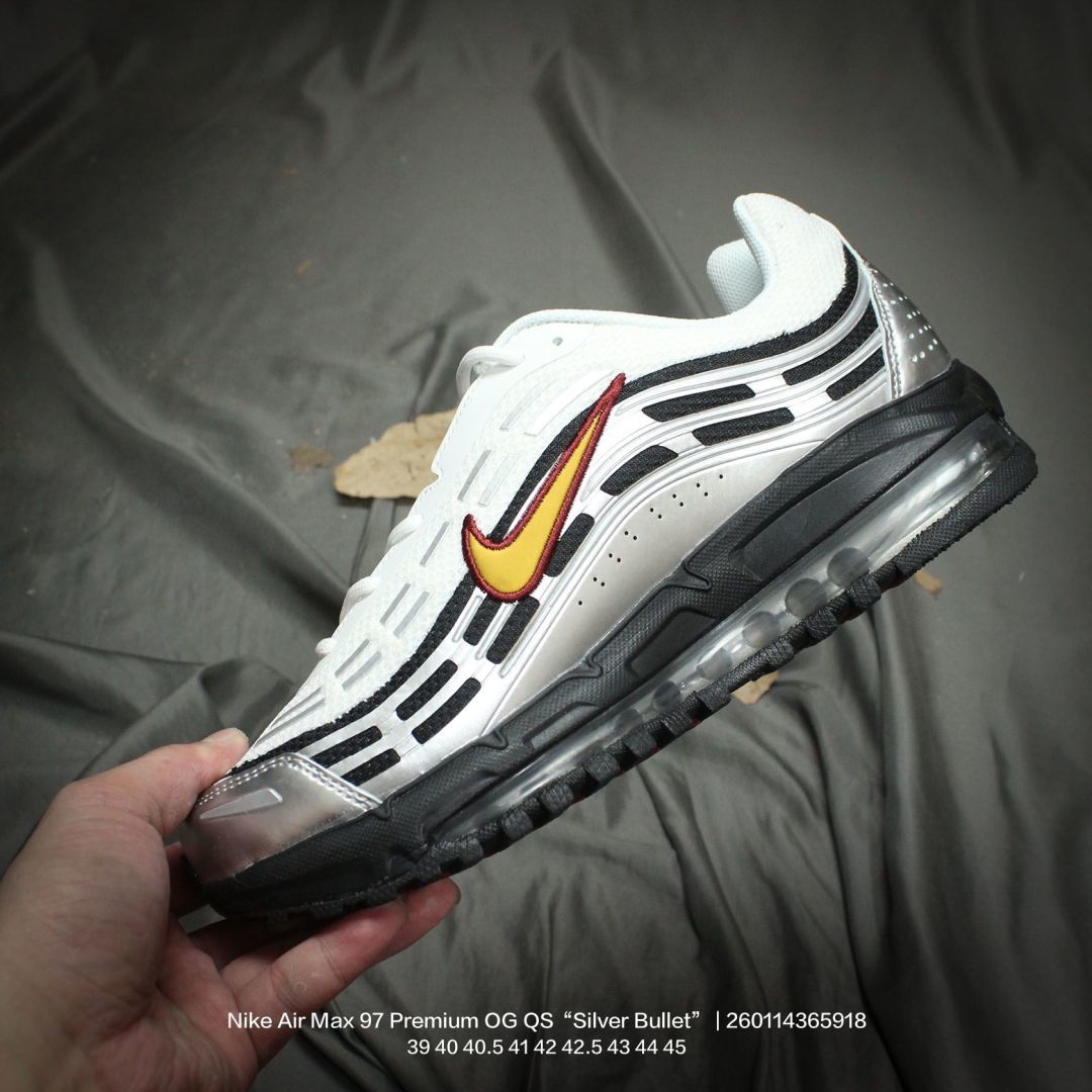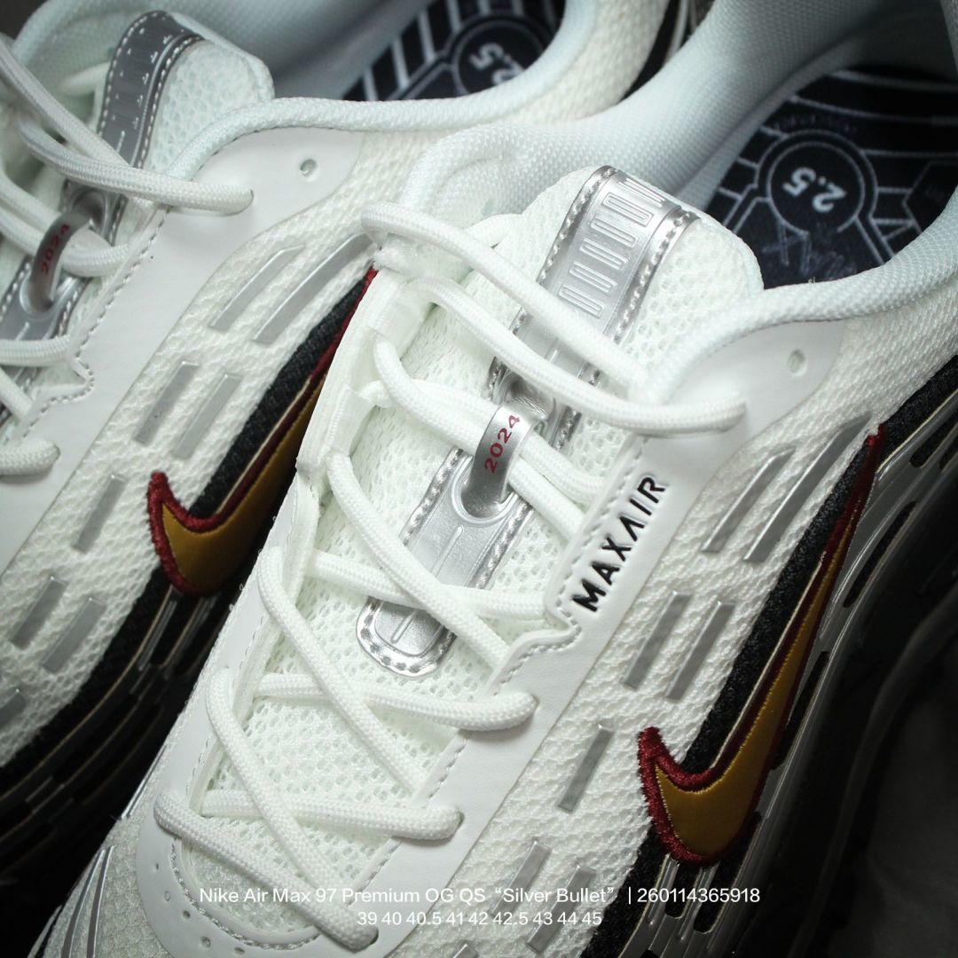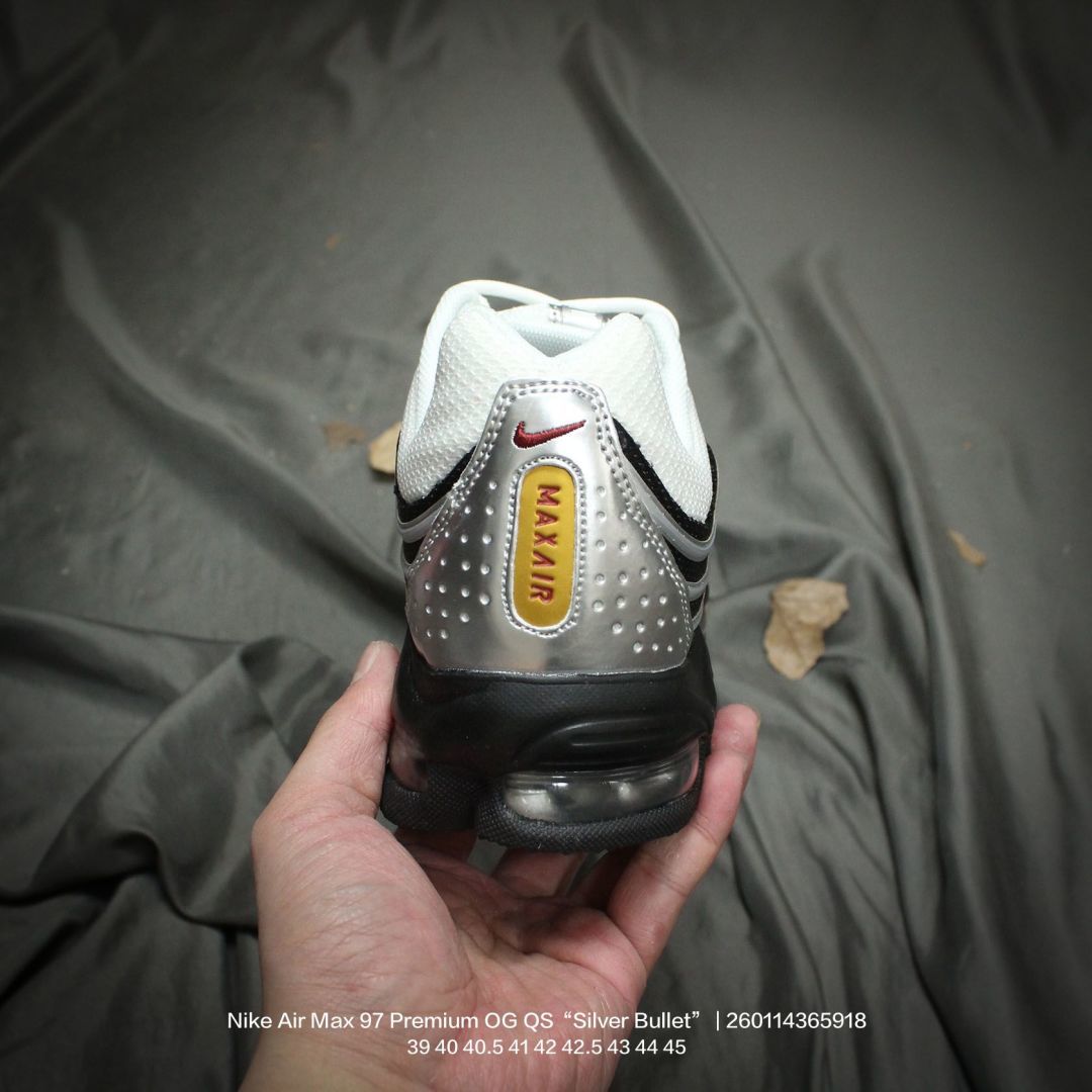 Nike 耐克 男鞋真标半码制 升级原楦开发楦型 正确雪花纤维革 原装铁丝材质透气网格 采用全新电脑针车缜密针痕 回弹PU模真气垫脚感大底经典OG配色 耐克Nike Air Max 97 Premium OG QS Silver Bullet 百搭复古气垫休闲运动慢跑鞋