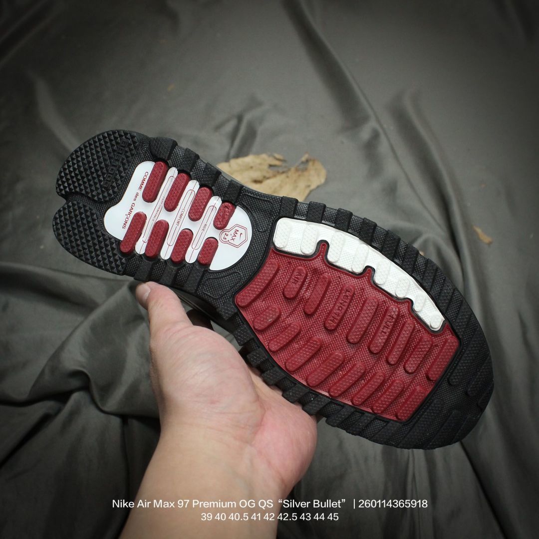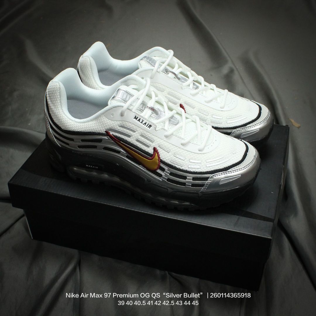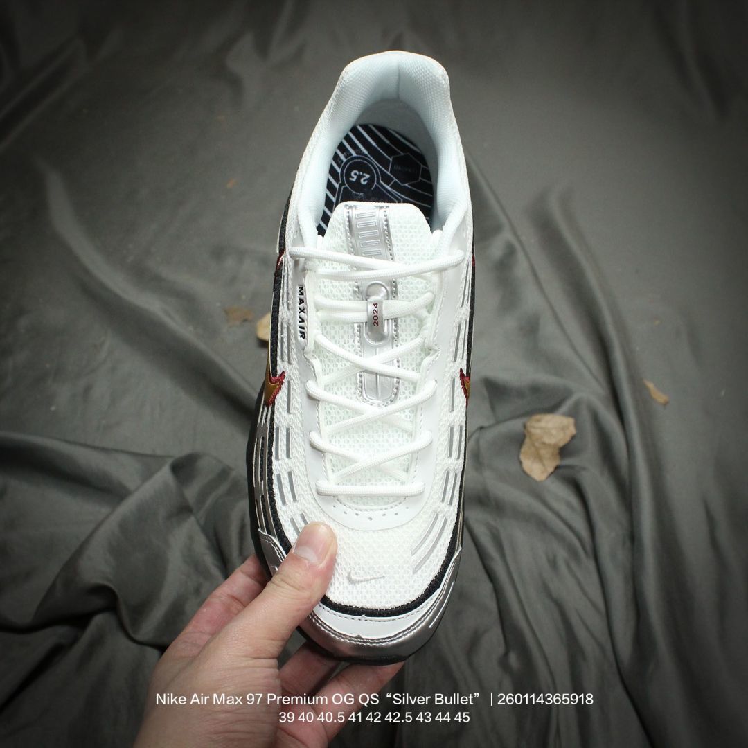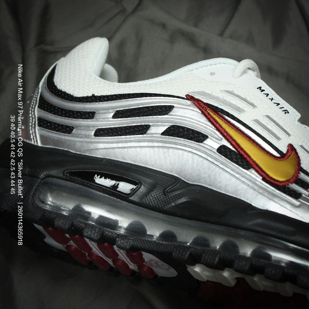 Nike 耐克 男鞋真标半码制 升级原楦开发楦型 正确雪花纤维革 原装铁丝材质透气网格 采用全新电脑针车缜密针痕 回弹PU模真气垫脚感大底经典OG配色 耐克Nike Air Max 97 Premium OG QS Silver Bullet 百搭复古气垫休闲运动慢跑鞋