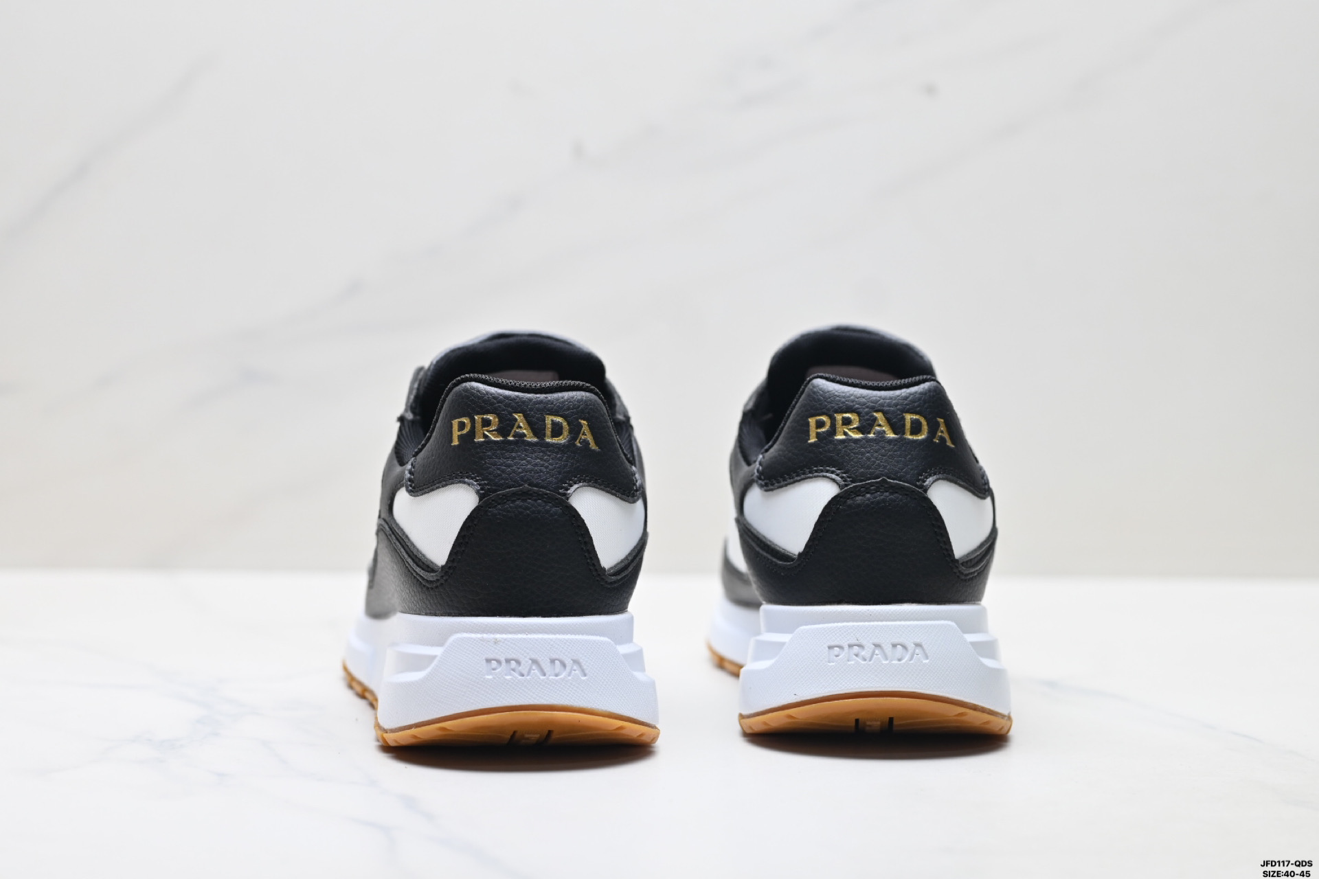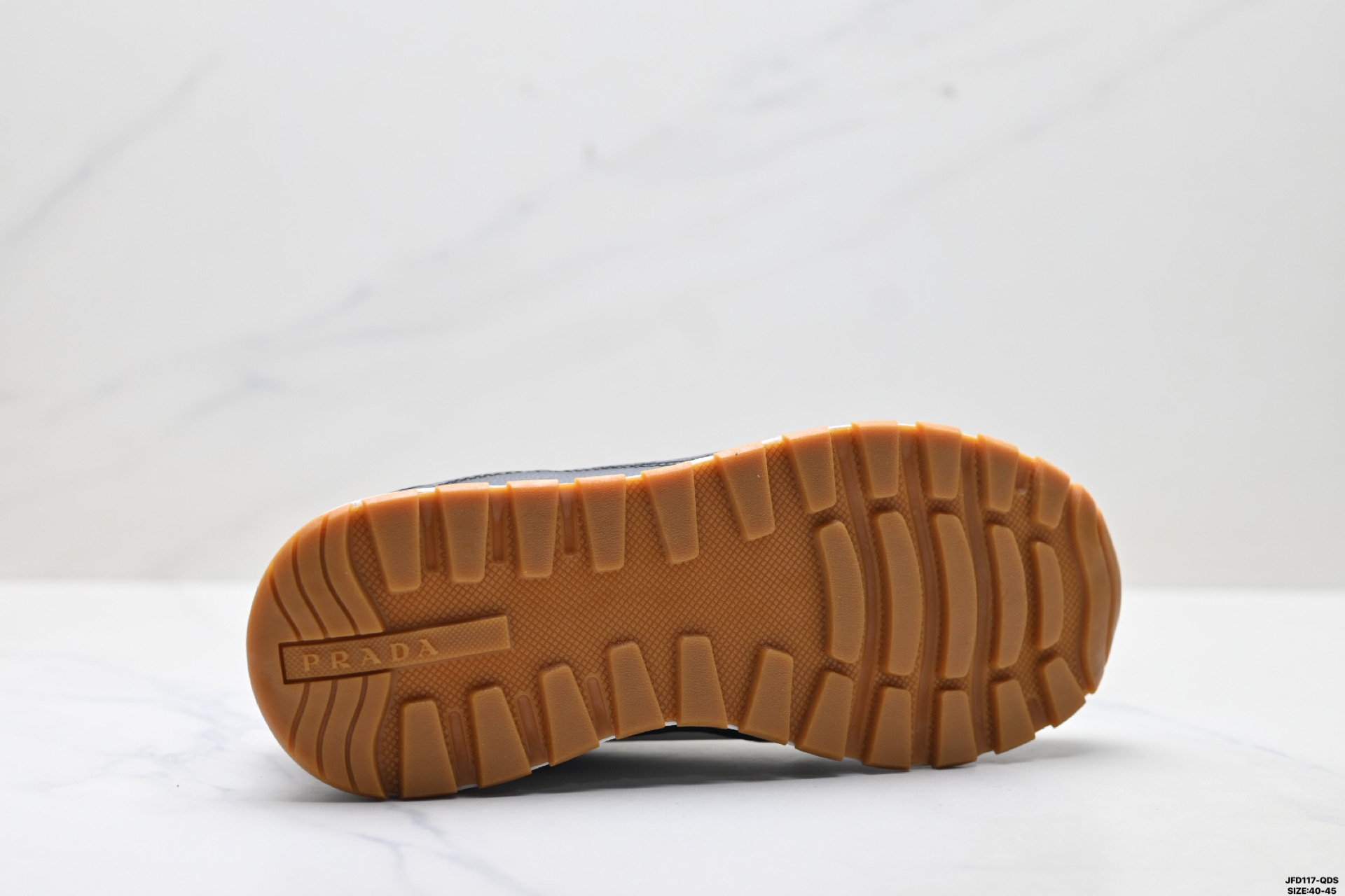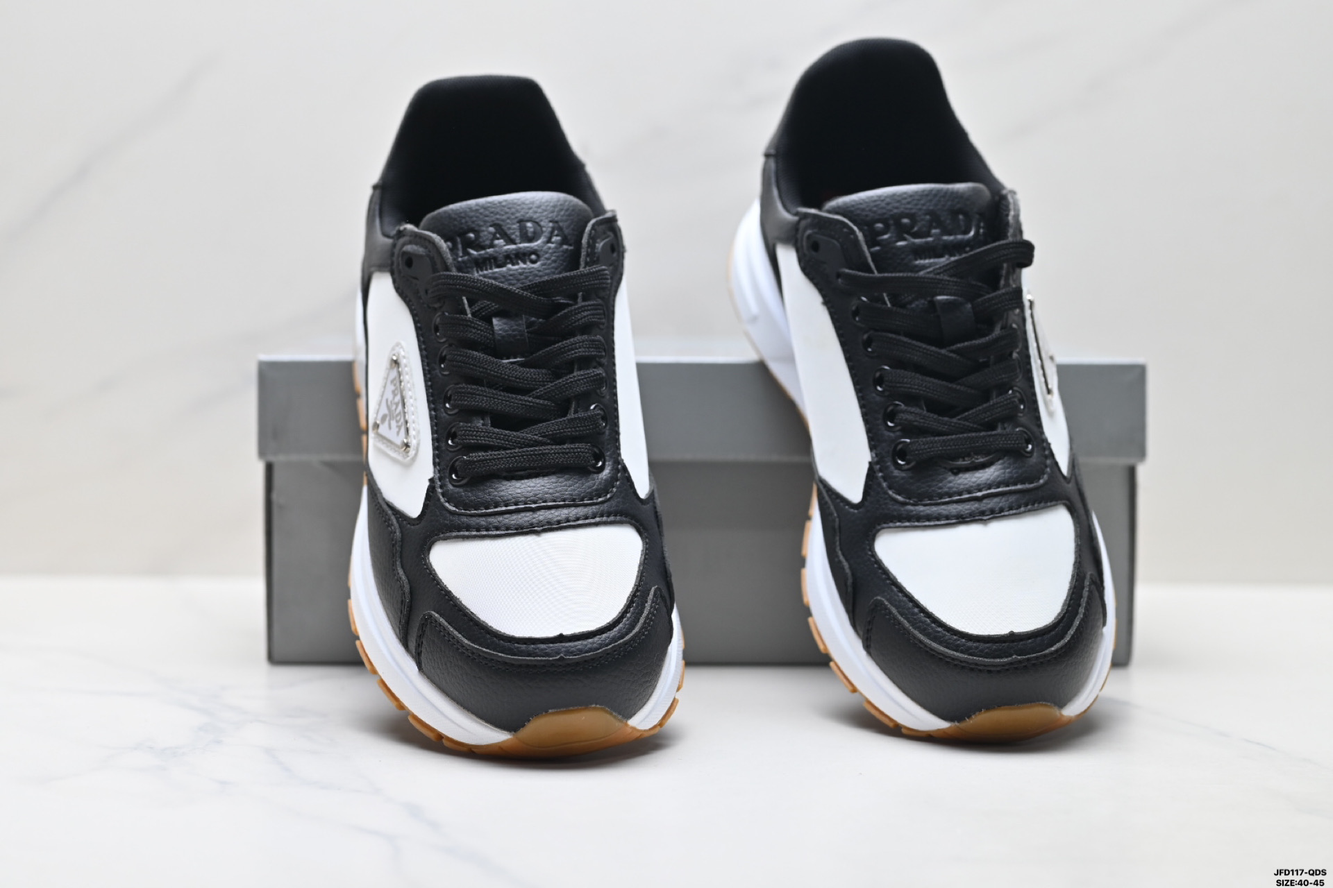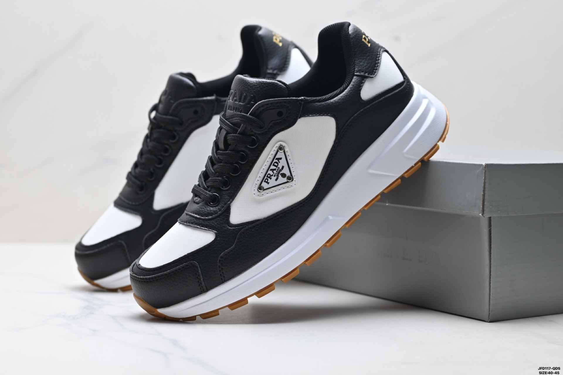 PRAX 01运动鞋设计优雅而创新 选用Prada 系列的经典机能性面料 鞋履选用以回收海洋塑胶废料制造的创新再生尼龙及抛光皮革缝制 采用厚实橡胶坑纹鞋底设计 鞋侧缀有全新运动风三角形标志 流露混搭魅力