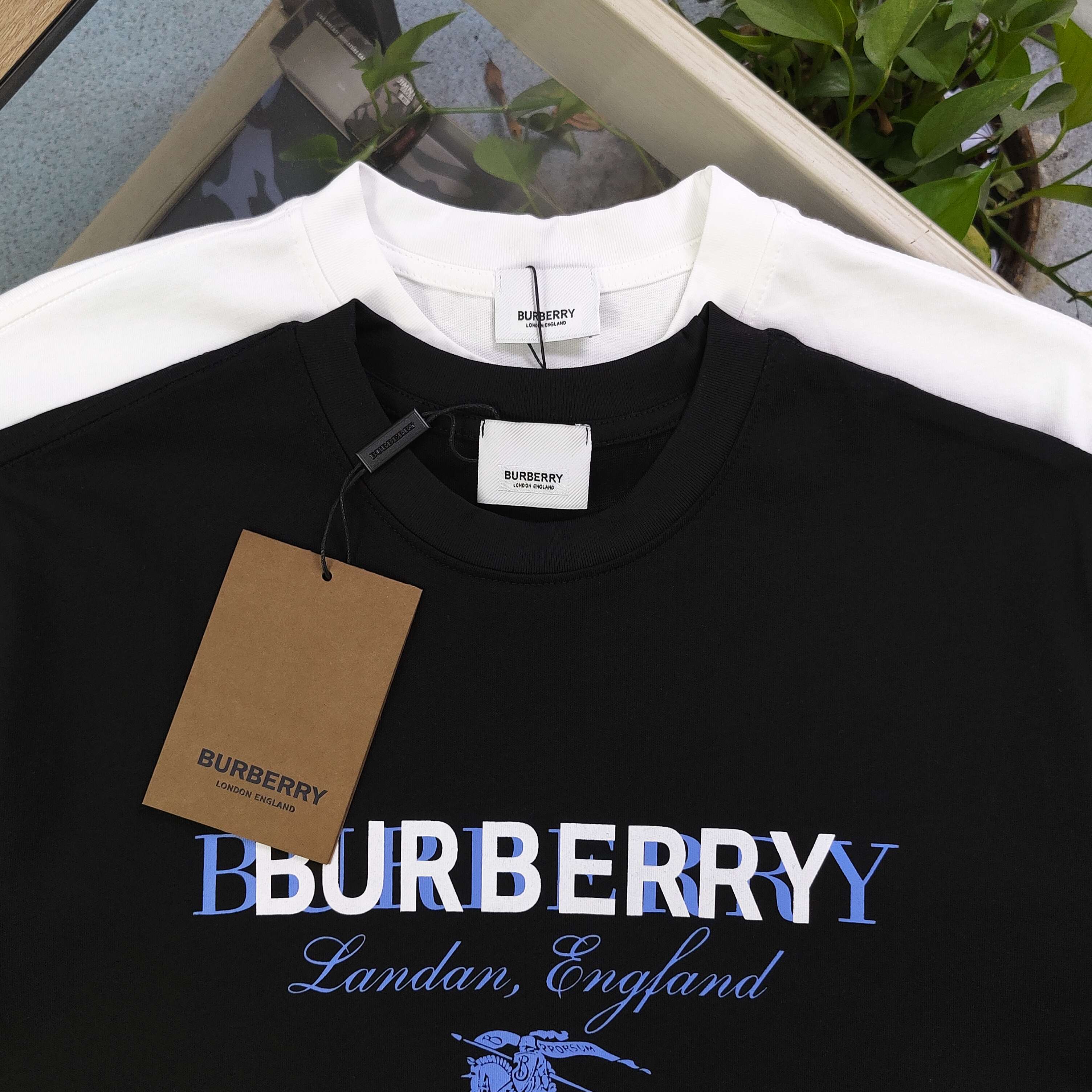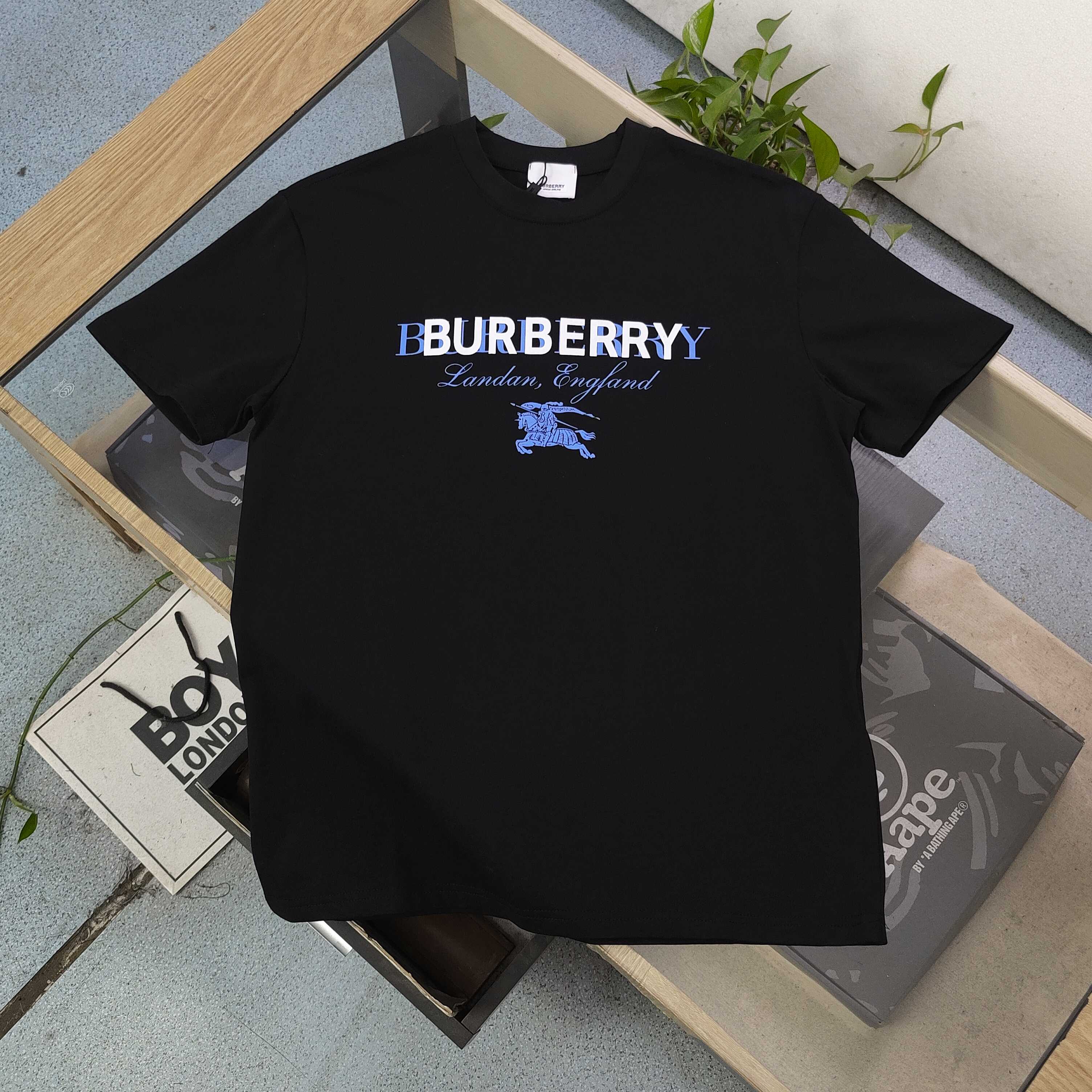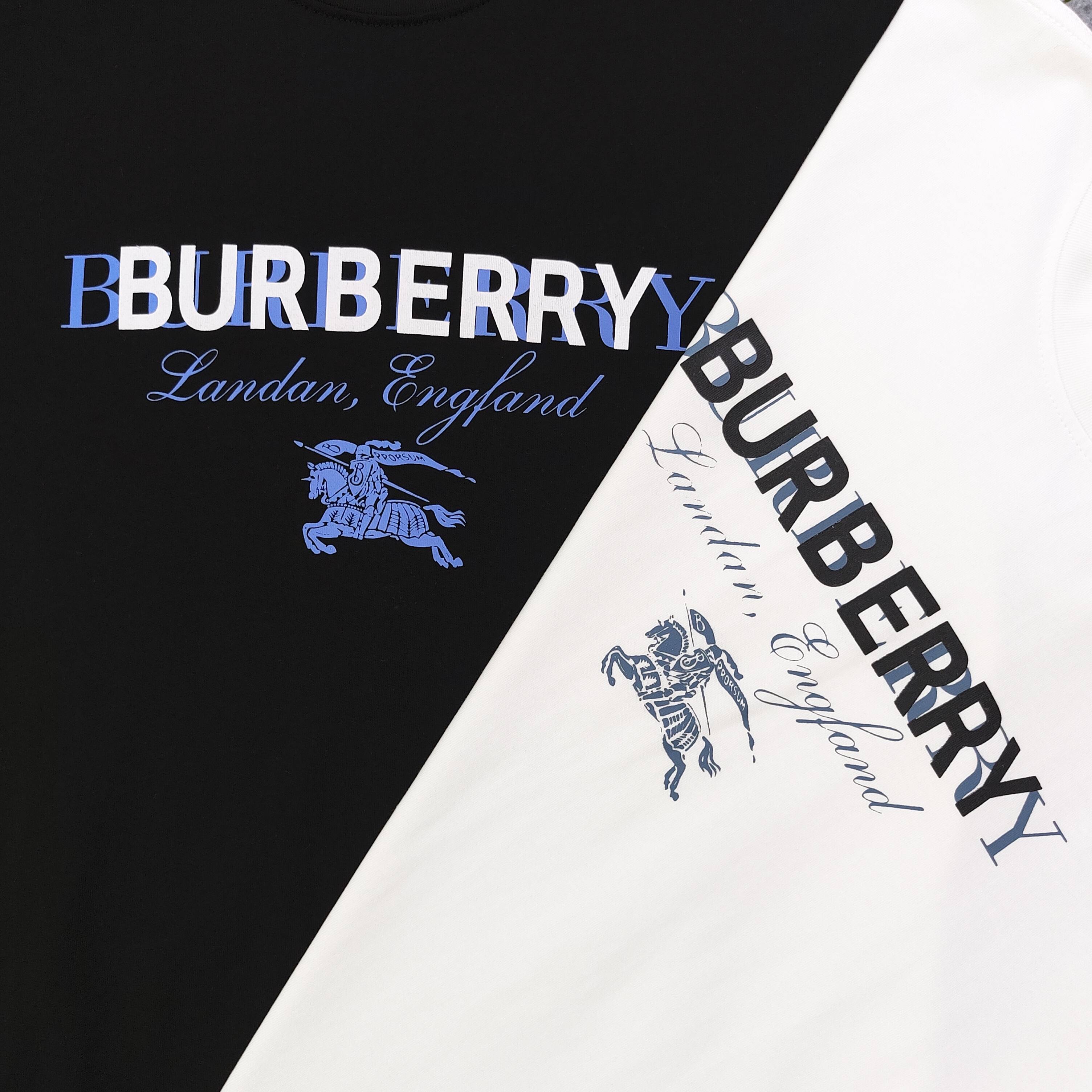 2025新款Burberry巴宝莉战马重叠字母图案logo印花休闲情侣圆领短袖T恤 采用32支双纱精梳纯棉爽滑手感 纯棉不起球不起毛 面料厚度240克重 单件重量280克左右 质量保证 定制面料 定制定染 包浆印刷环保不开裂 欢迎对比质量 男女同款