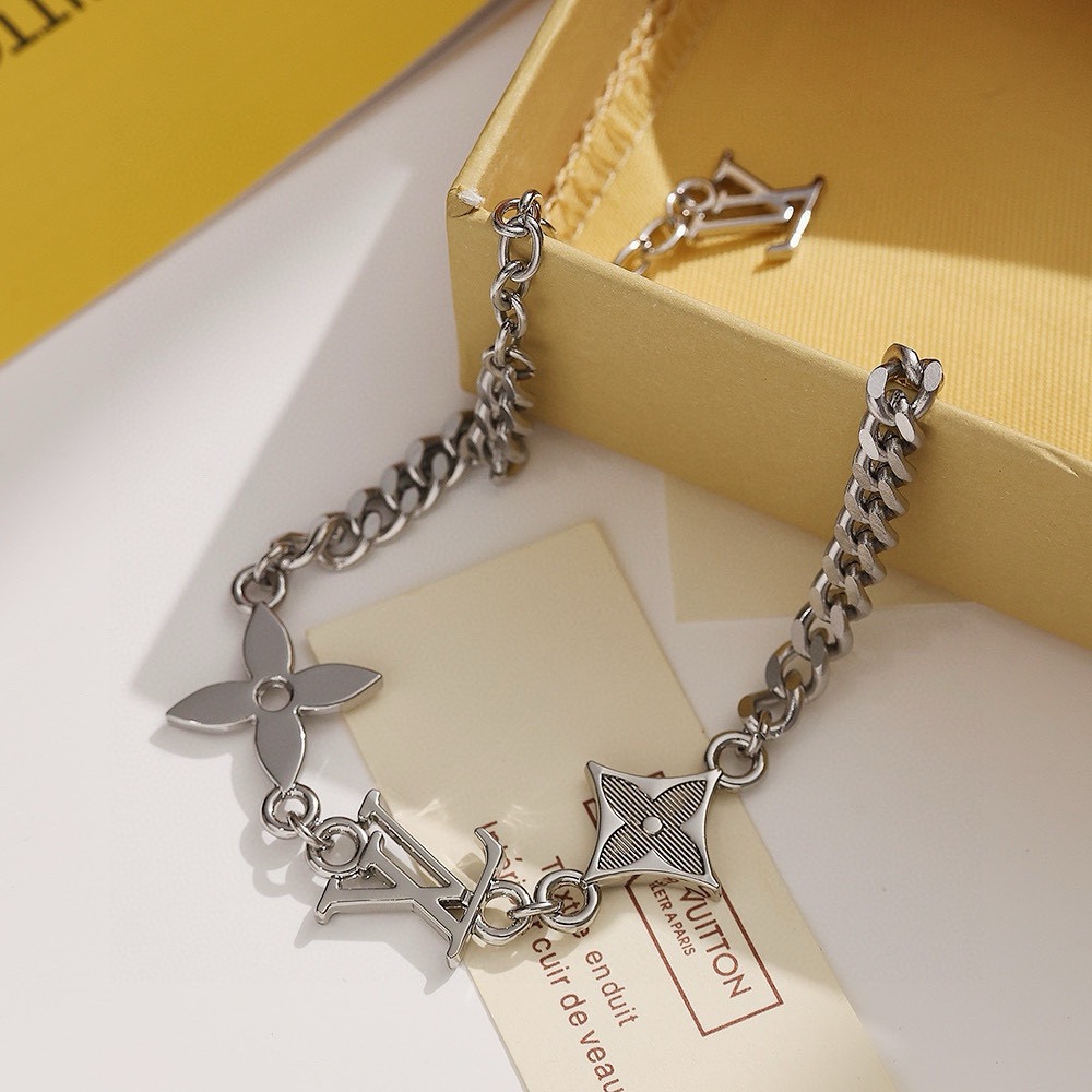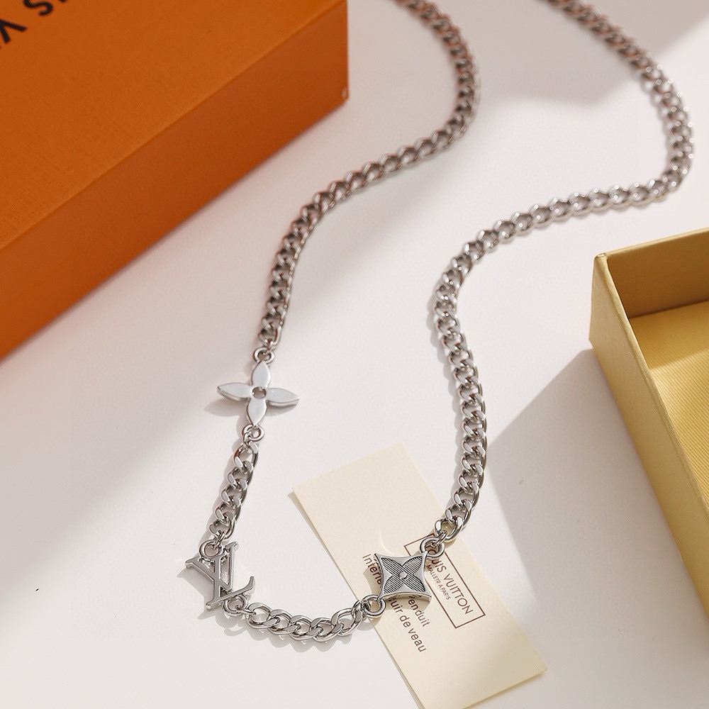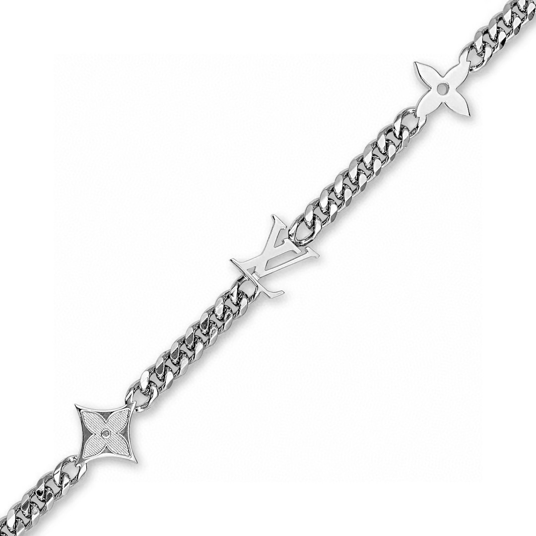 LV路易威登新三花银项链 配全套包装 MNG Row 项链为纤细抛光金属链条融入 LV 字母和 Monogram 图案 再以别致铭纹钩扣实现创意开合 优雅比例与品牌元素相得益彰 可为休闲造型注入考究气息