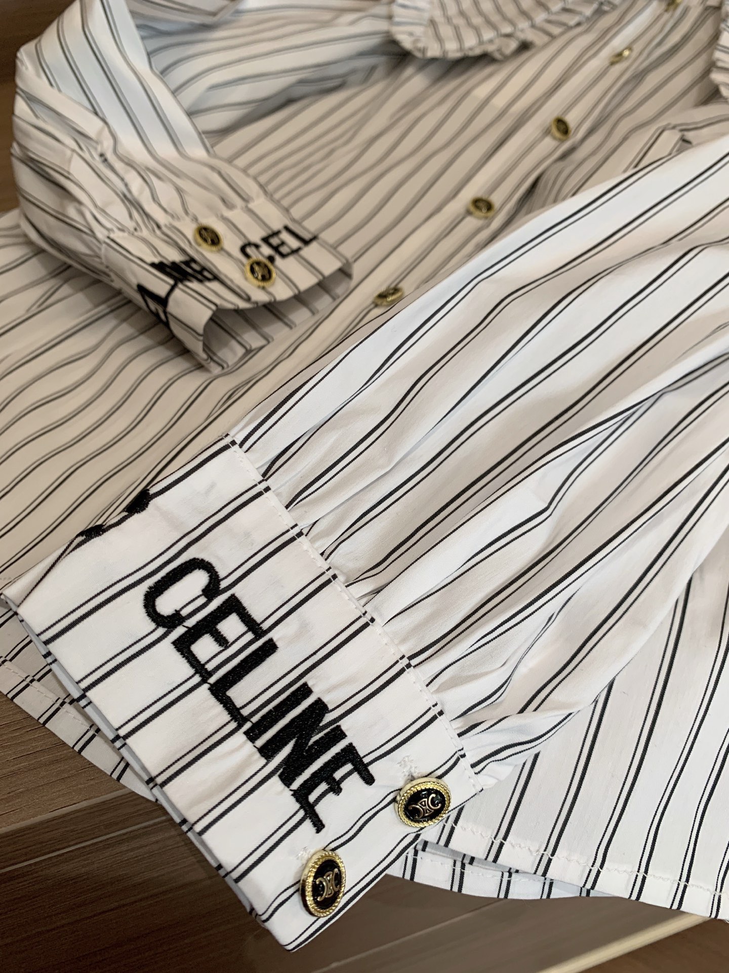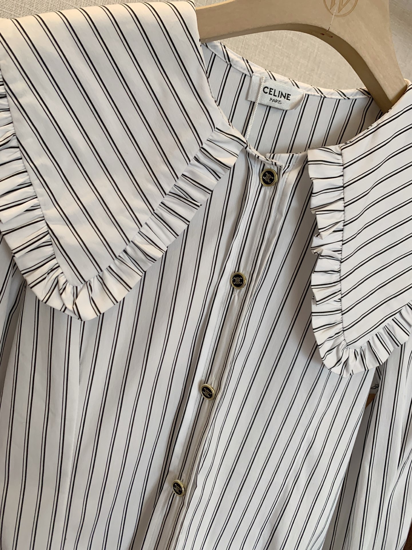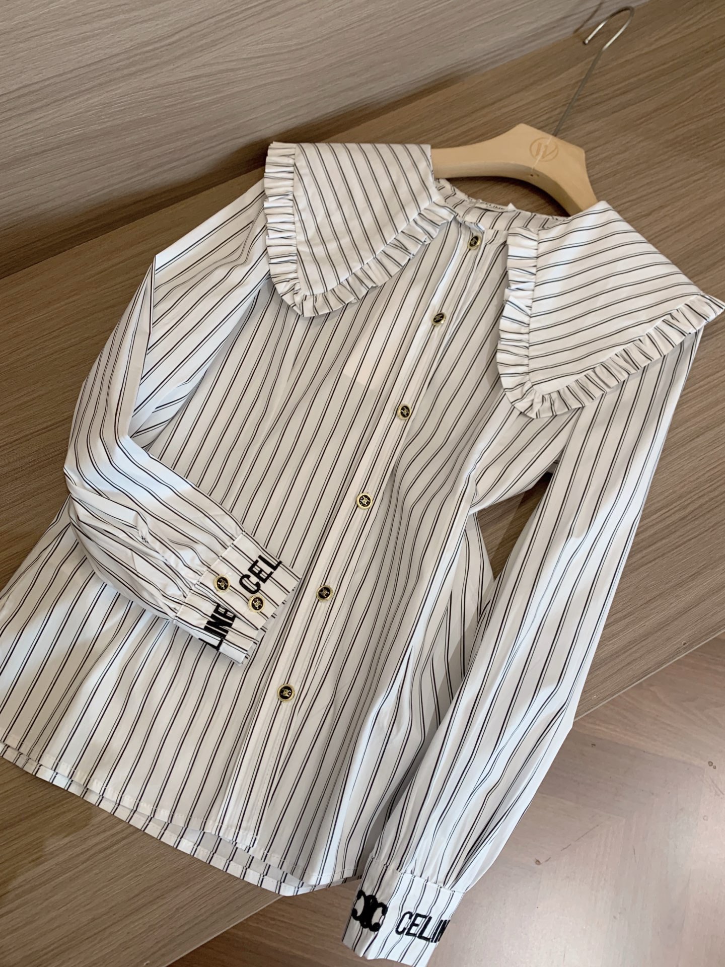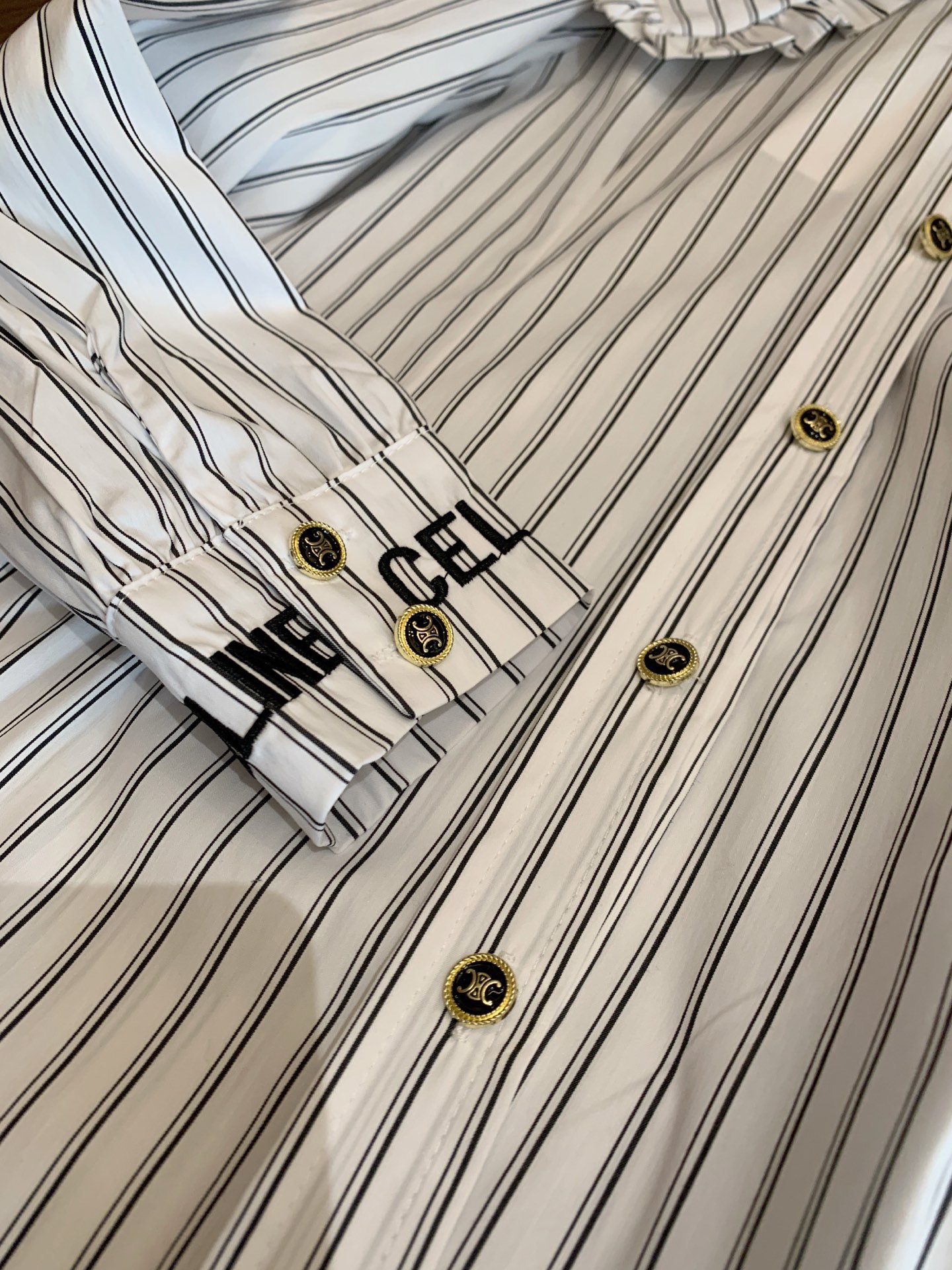 Celine赛琳字母刺绣定制凯旋门纽扣褶皱荷叶边翻领条纹衬衫